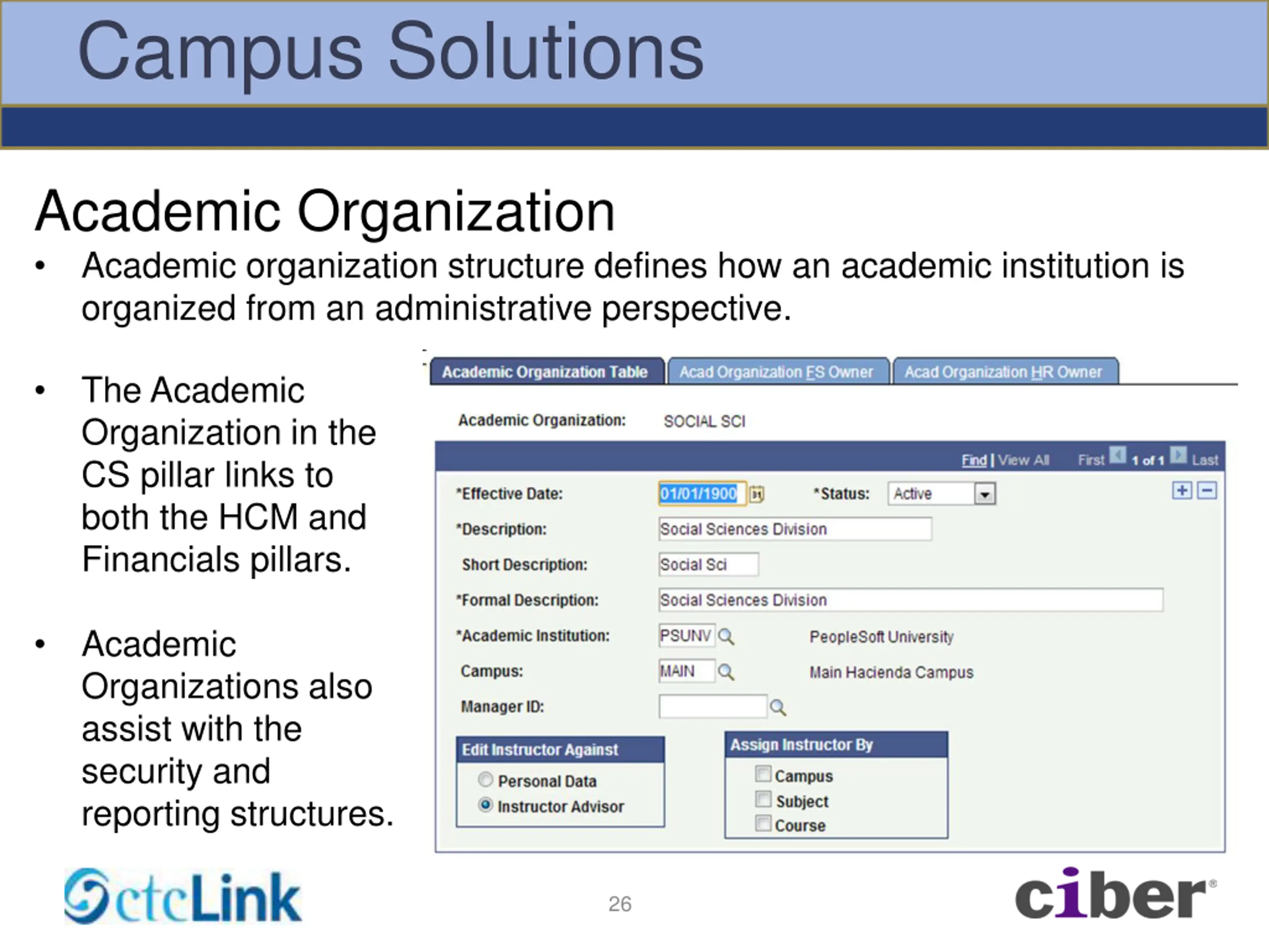Campus Solutions Academic Organization Academic organization structure defines how an academic institution is organized from an administrative perspective. The Academic Organization in the CS pillar links to both the HCM and Financials pillars. Academic Organizations also assist with the security and reporting structures. 26