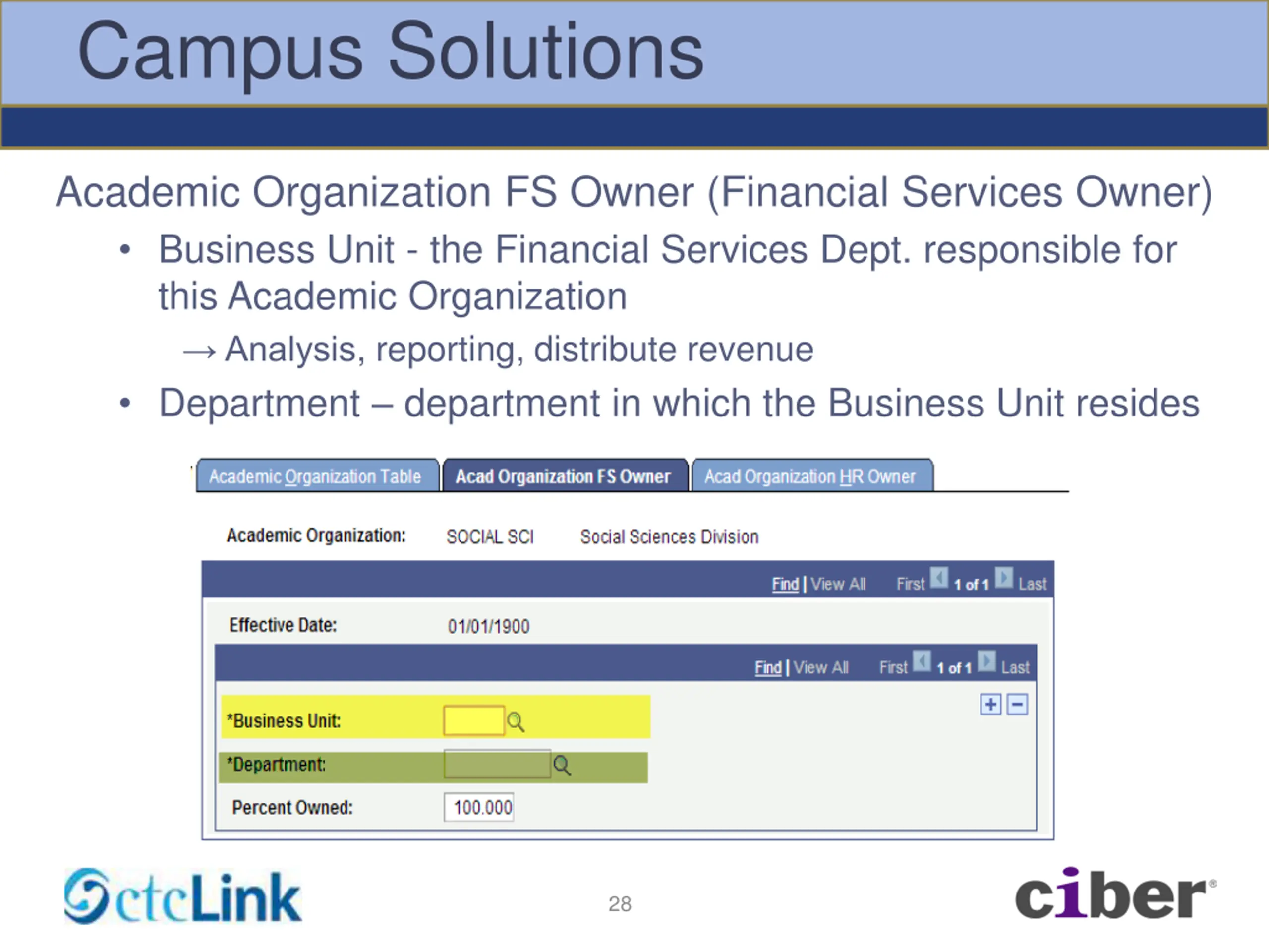 Campus Solutions Academic Organization FS Owner (Financial Services Owner) Business Unit - the Financial Services Dept. responsible for this Academic Organization Analysis, reporting, distribute revenue Department department in which the Business Unit resides 27