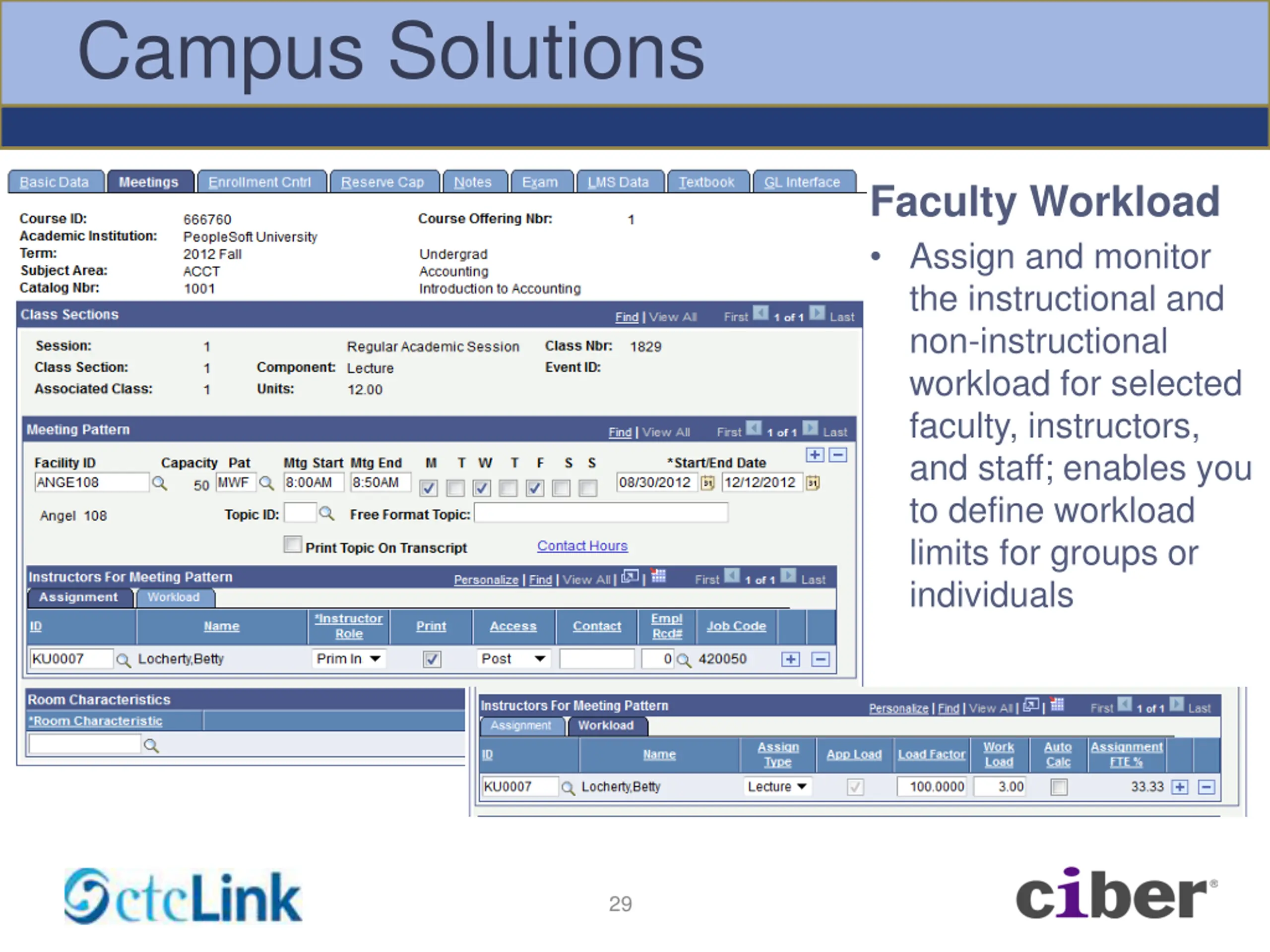 Campus Solutions Faculty Workload Assign and monitor the instructional and non-instructional workload for selected faculty, instructors, and staff; enables you to define workload limits for groups or individuals 29