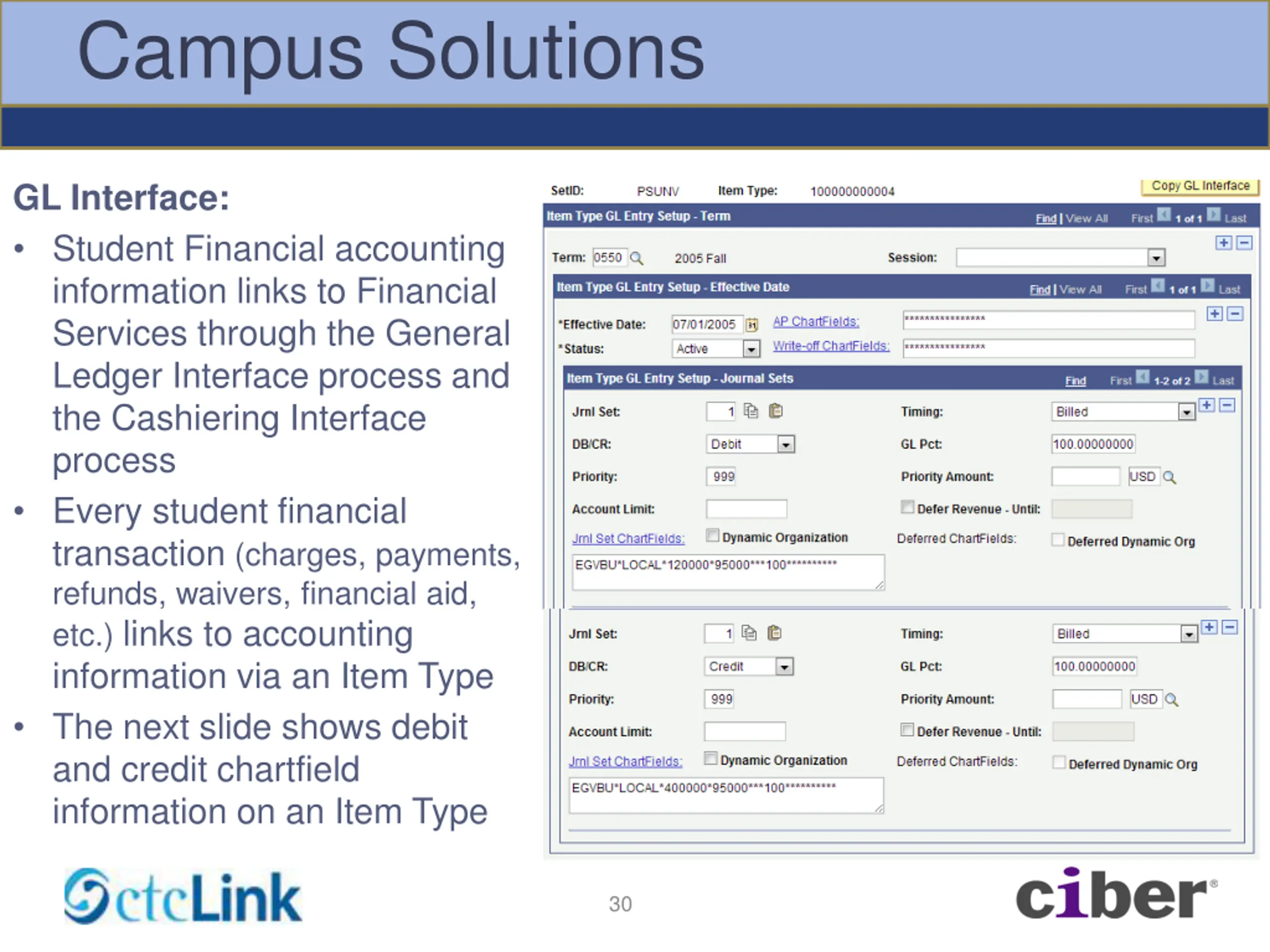 Campus Solutions GL Interface: Student Financial accounting information links to Financial Services through the General Ledger Interface process and the Cashiering Interface process Every student financial transaction (charges, payments, refunds, waivers, financial aid, etc.) links to accounting information via an Item Type The next slide shows debit and credit chartfield information on an Item Type 30
