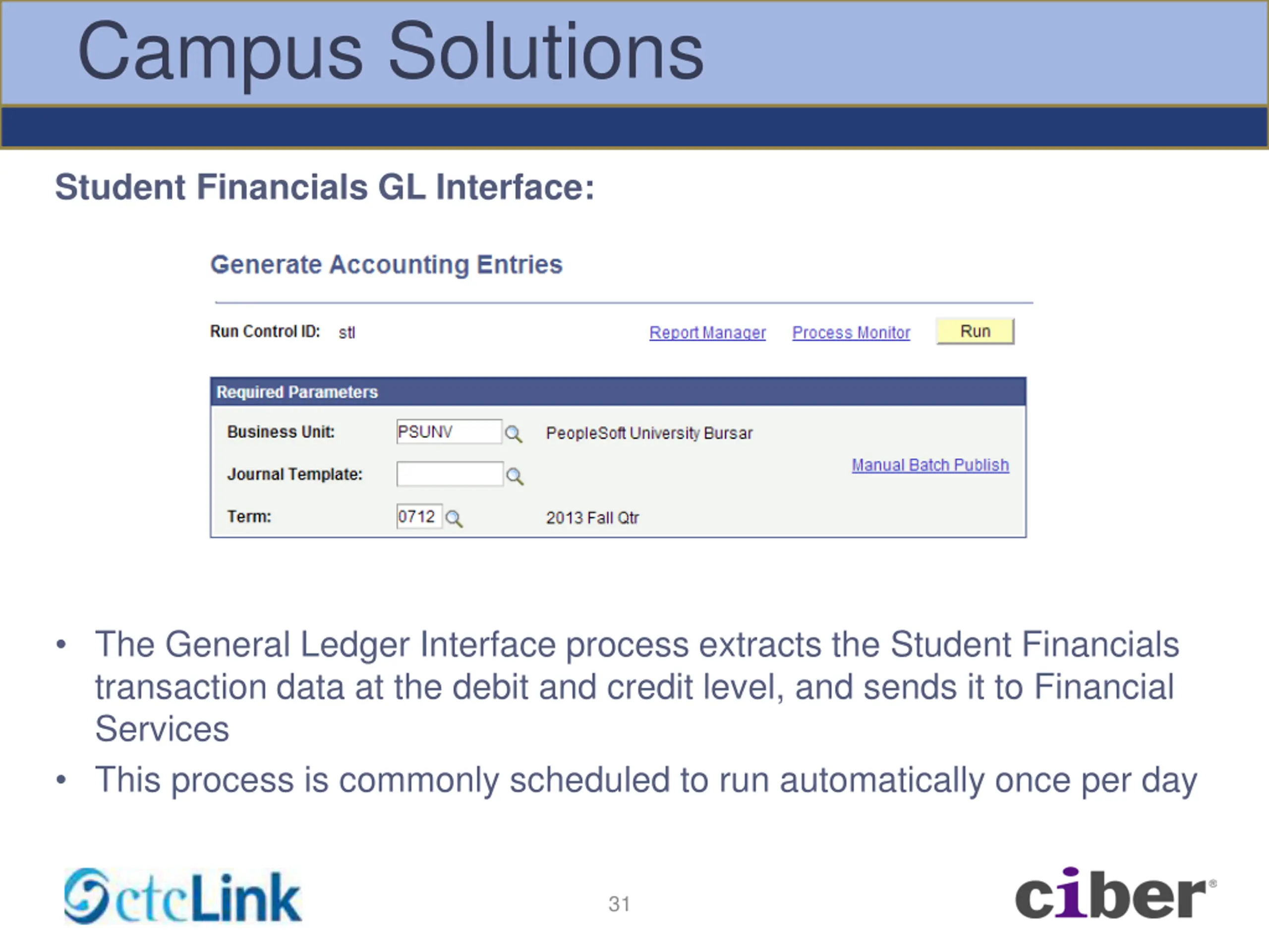 Campus Solutions Student Financials GL Interface: The General Ledger Interface process extracts the Student Financials transaction data at the debit and credit level, and sends it to Financial Services This process is commonly scheduled to run automatically once per day 31