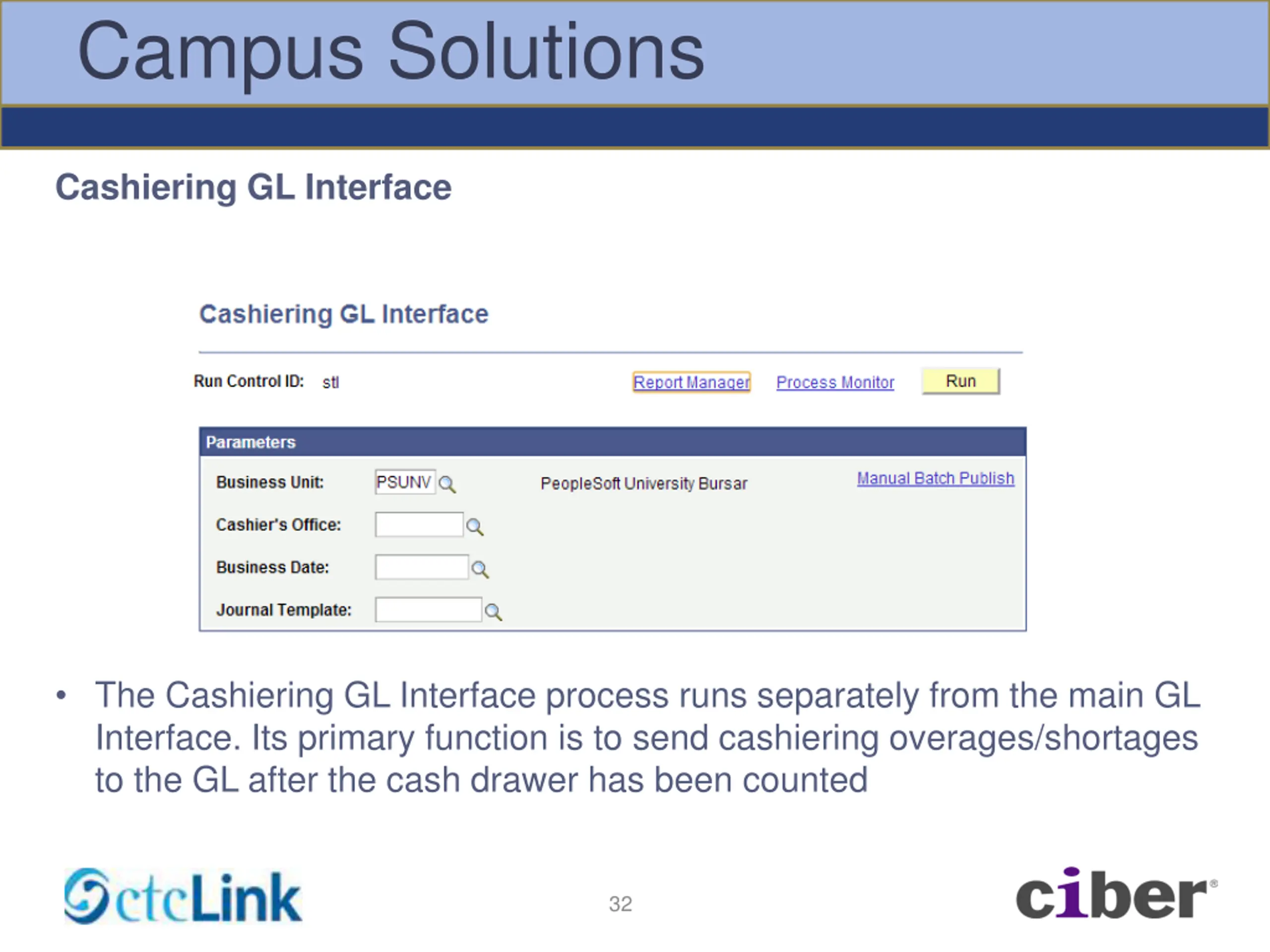 Campus Solutions Cashiering GL Interface The Cashiering GL Interface process runs separately from the main GL Interface. Its primary function is to send cashiering overages/shortages to the GL after the cash drawer has been counted 32