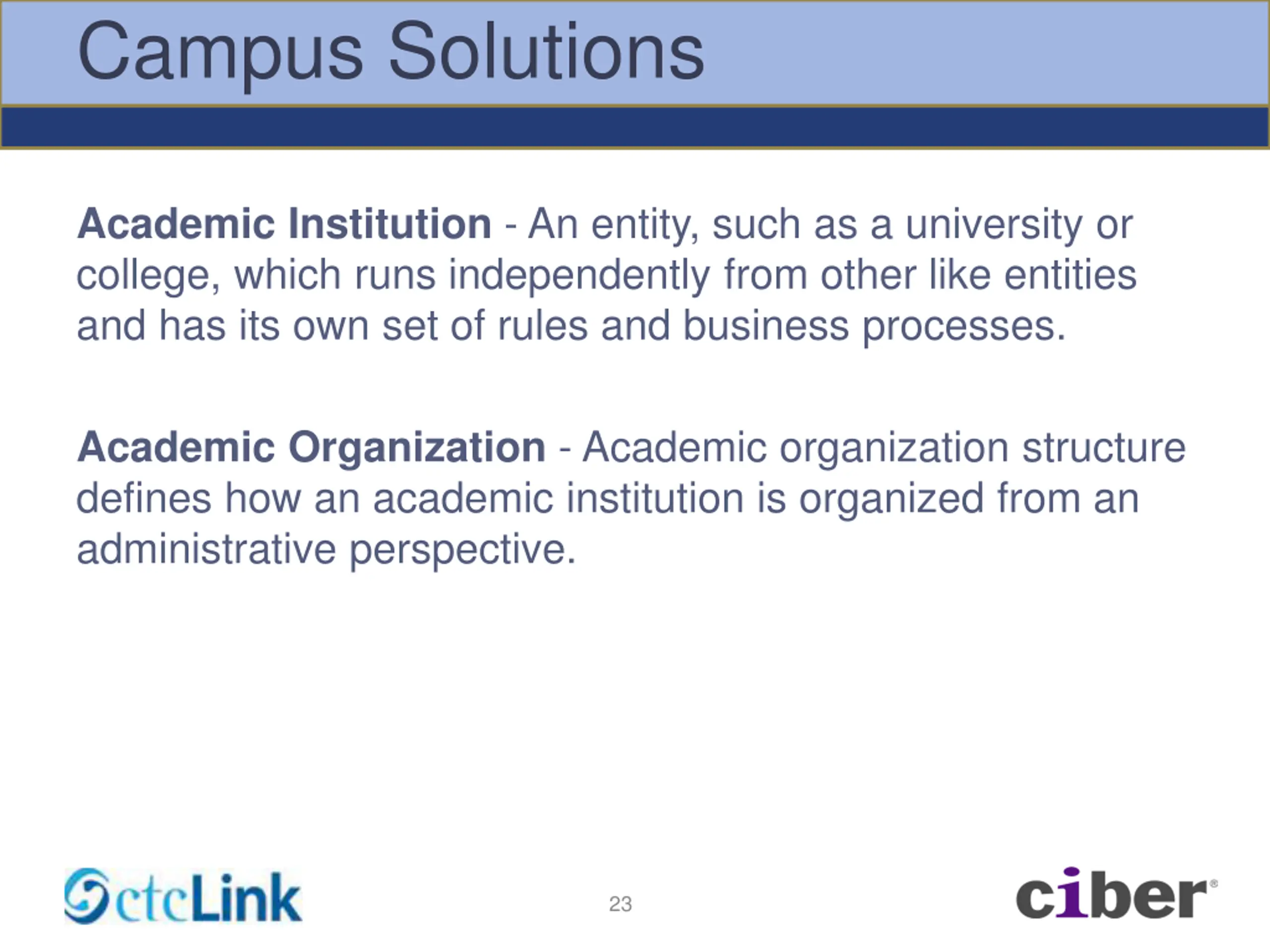 Campus Solutions Academic Institution - An entity, such as a university or college, which runs independently from other like entities and has its own set of rules and business processes. Academic Organization - Academic organization structure defines how an academic institution is organized from an administrative perspective. 23