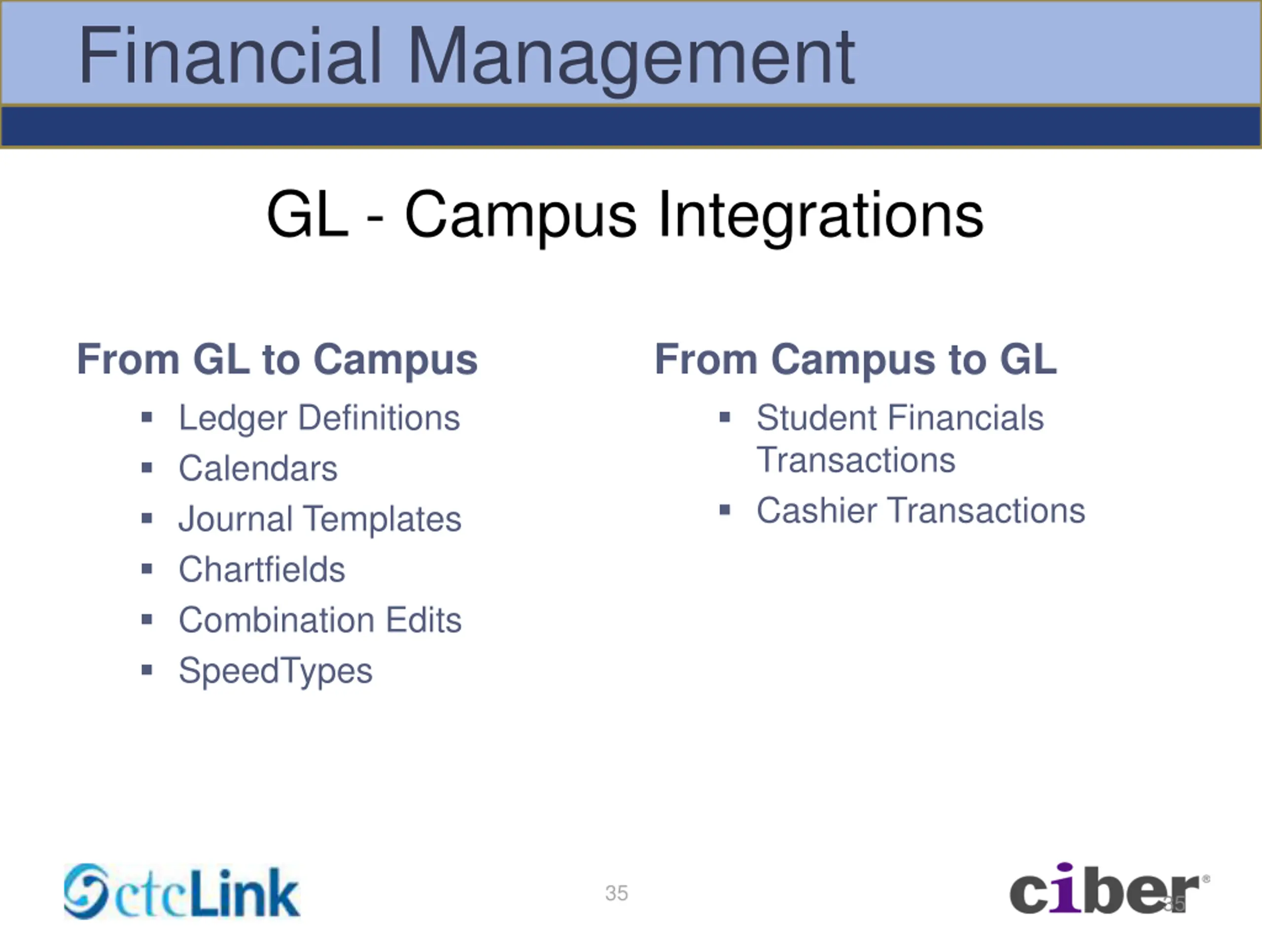 Financial Management GL - Campus Integrations From GL to Campus Ledger Definitions Calendars Journal Templates Chartfields Combination Edits SpeedTypes From Campus to GL Student Financials Transactions Cashier Transactions 35 35