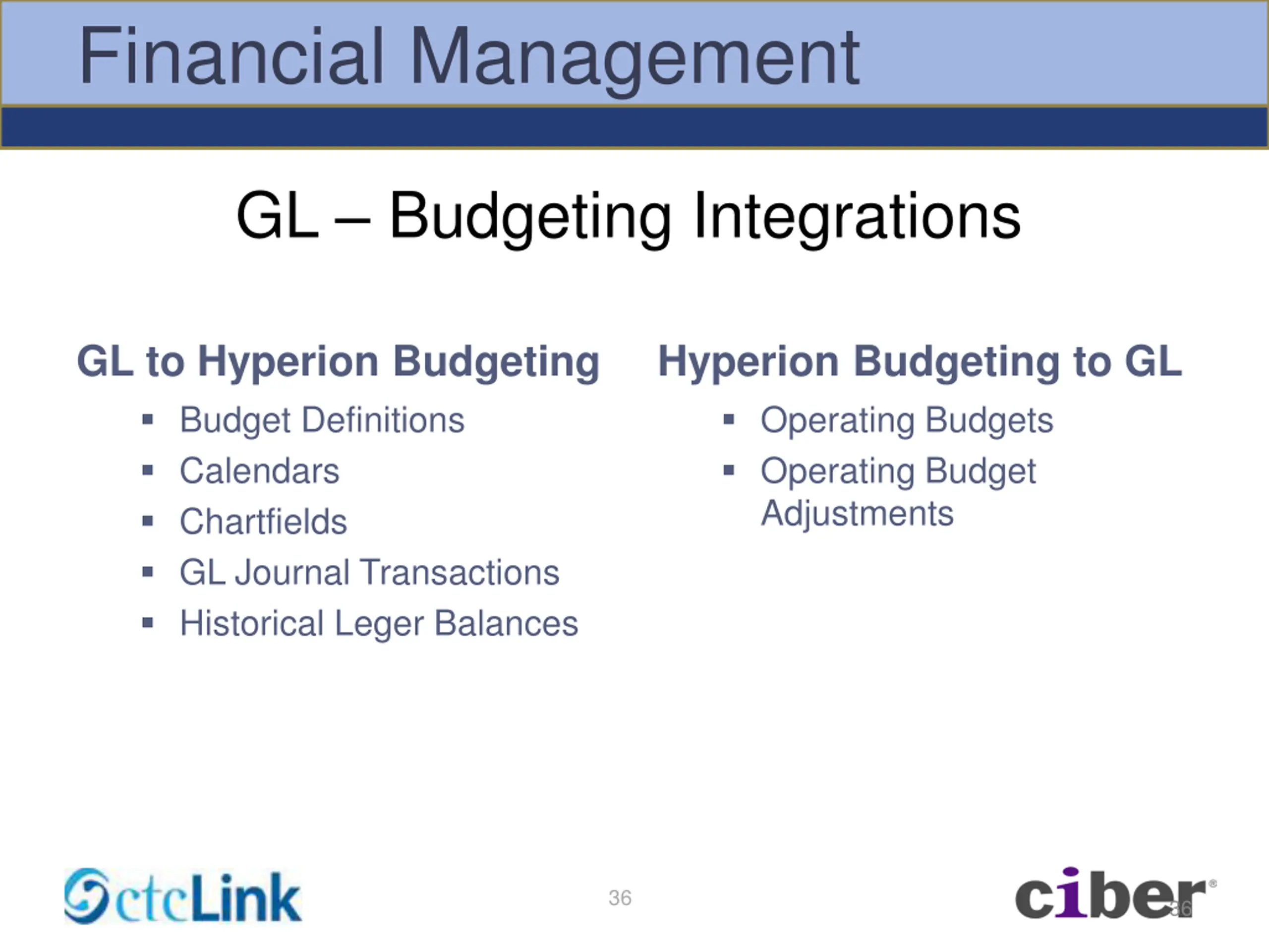 Financial Management GL Budgeting Integrations GL to Hyperion Budgeting Budget Definitions Calendars Chartfields GL Journal Transactions Historical Leger Balances Hyperion Budgeting to GL Operating Budgets Operating Budget Adjustments 36 36