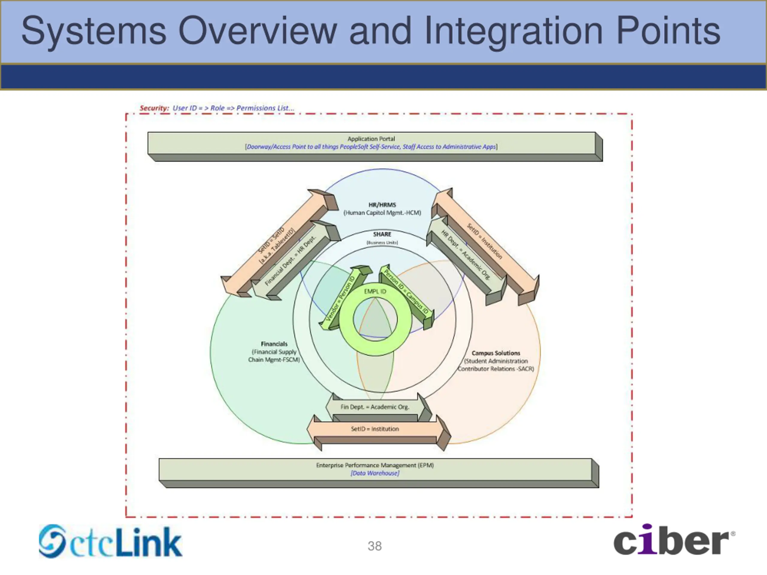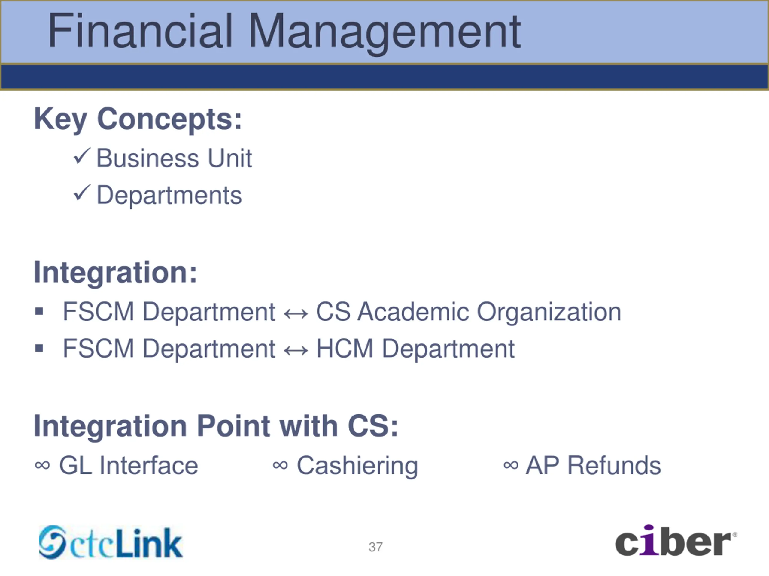 Financial Management Key Concepts: Business Unit Departments Integration: FSCM Department FSCM Department CS Academic Organization HCM Department Integration Point with CS: GL Interface Cashiering AP Refunds 37