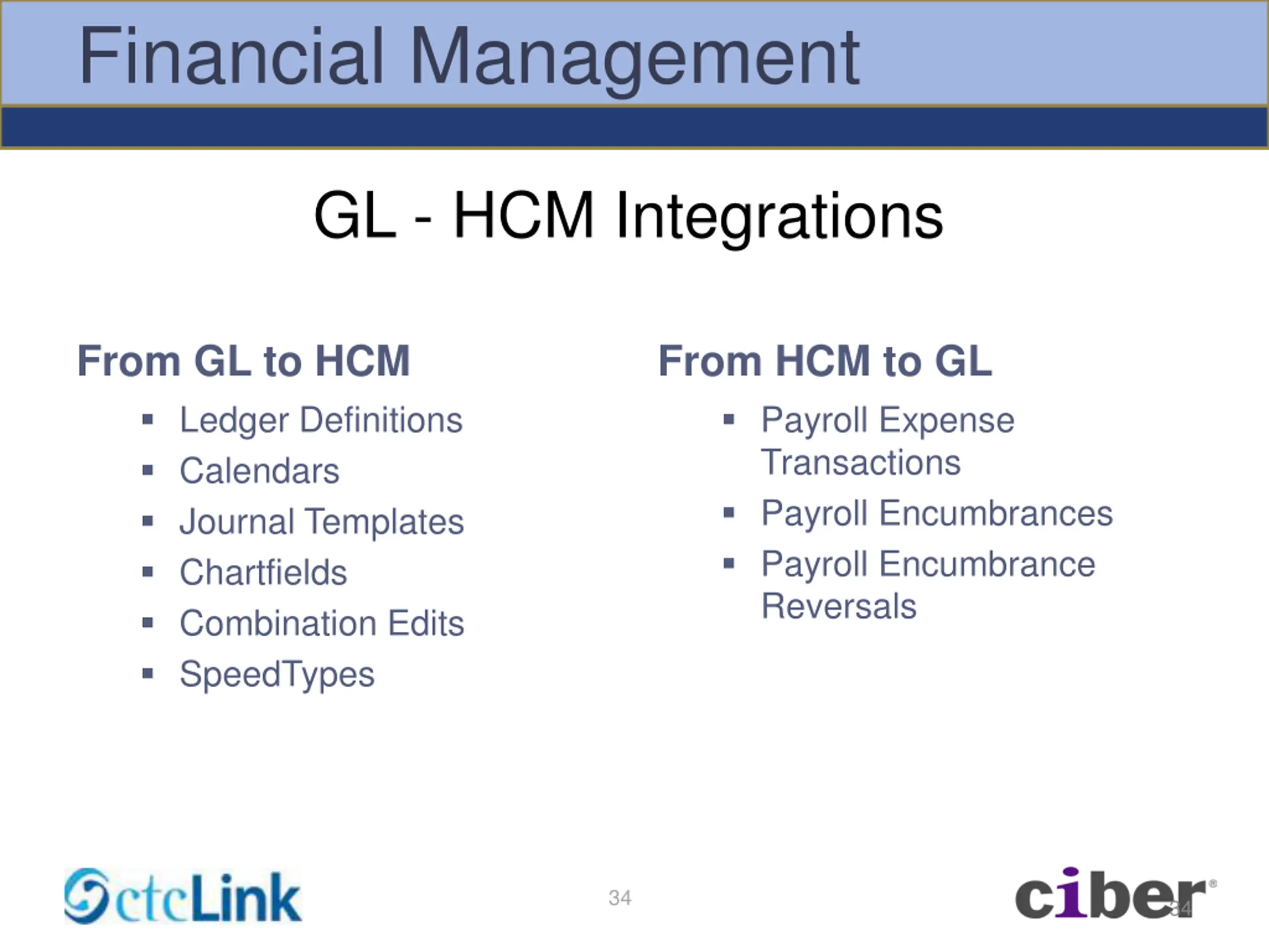 Financial Management GL - HCM Integrations From GL to HCM Ledger Definitions Calendars Journal Templates Chartfields Combination Edits SpeedTypes From HCM to GL Payroll Expense Transactions Payroll Encumbrances Payroll Encumbrance Reversals 34 34