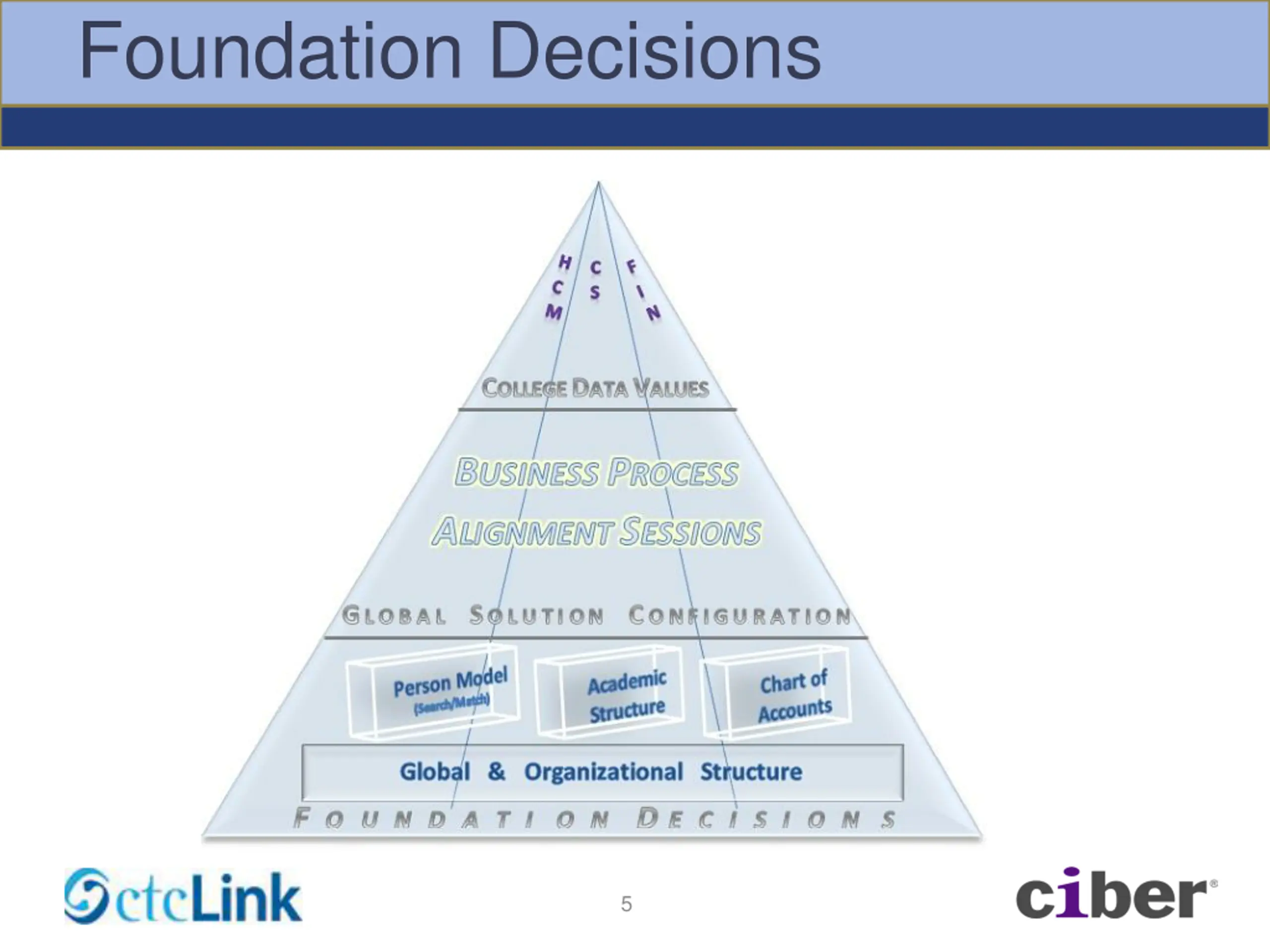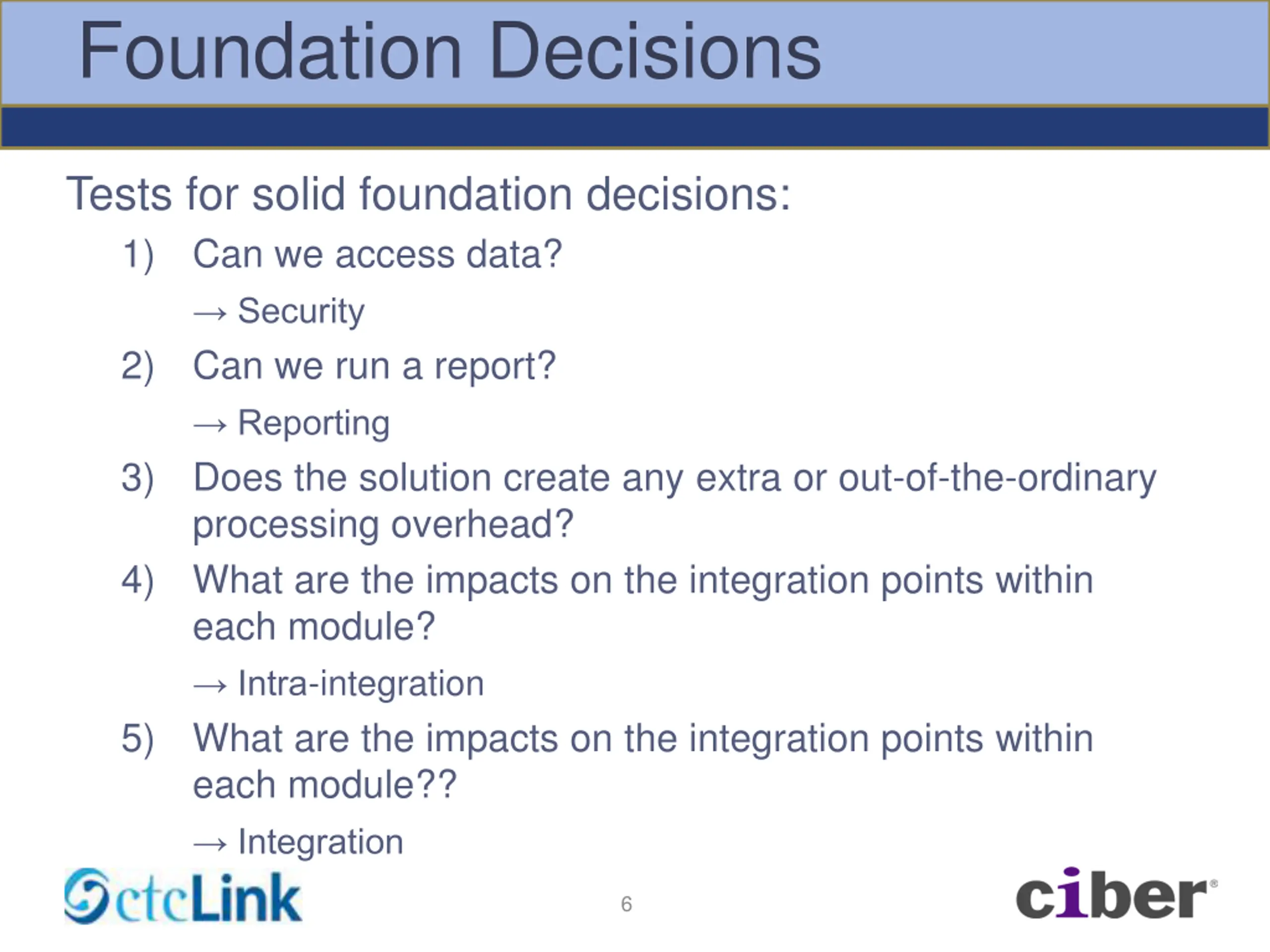 Foundation Decisions Tests for solid foundation decisions: 1) Can we access data? Security 2) Can we run a report? Reporting 3) Does the solution create any extra or out-of-the-ordinary processing overhead? 4) What are the impacts on the integration points within each module? Intra-integration 5) What are the impacts on the integration points within each module?? Integration 6