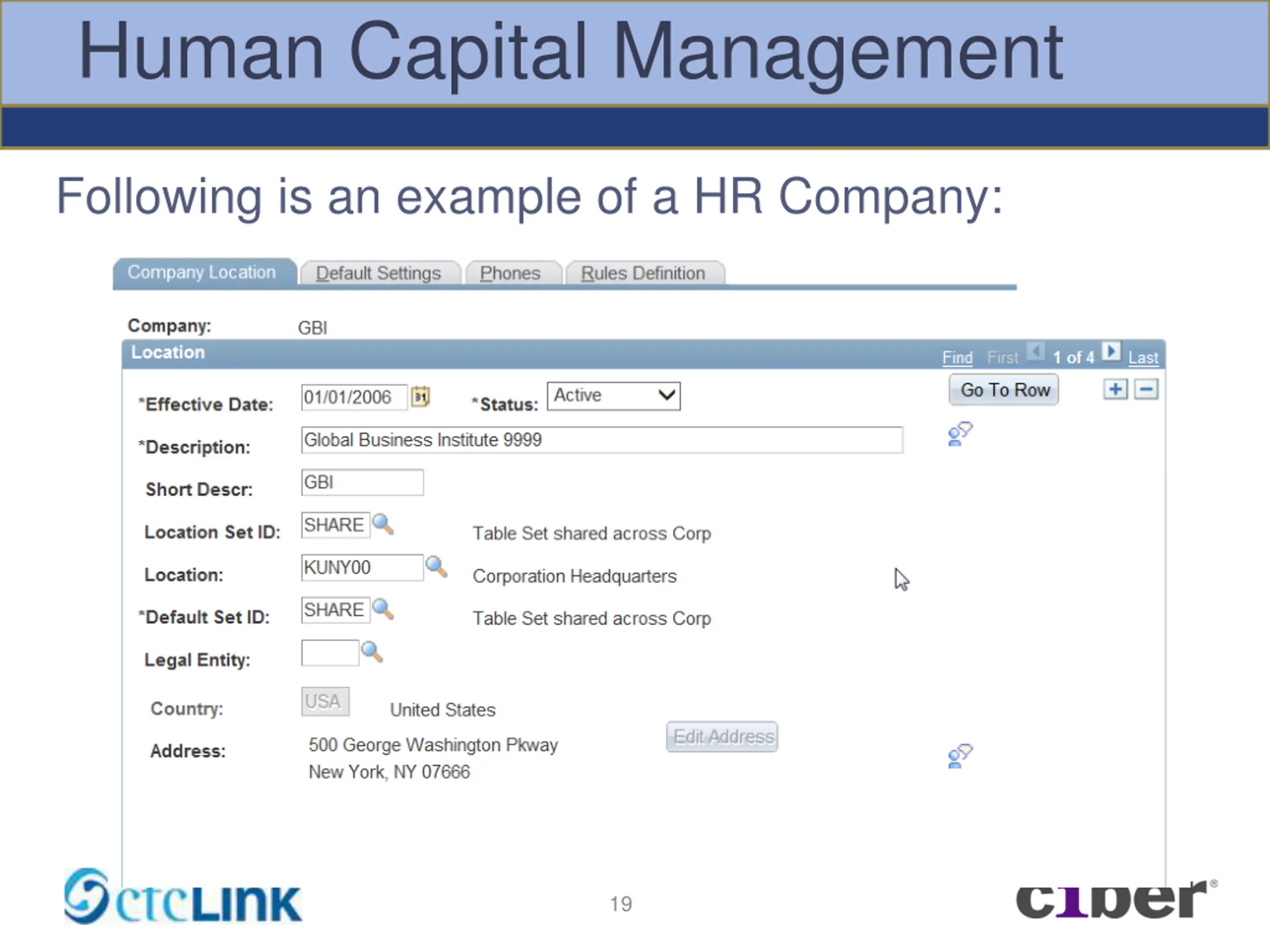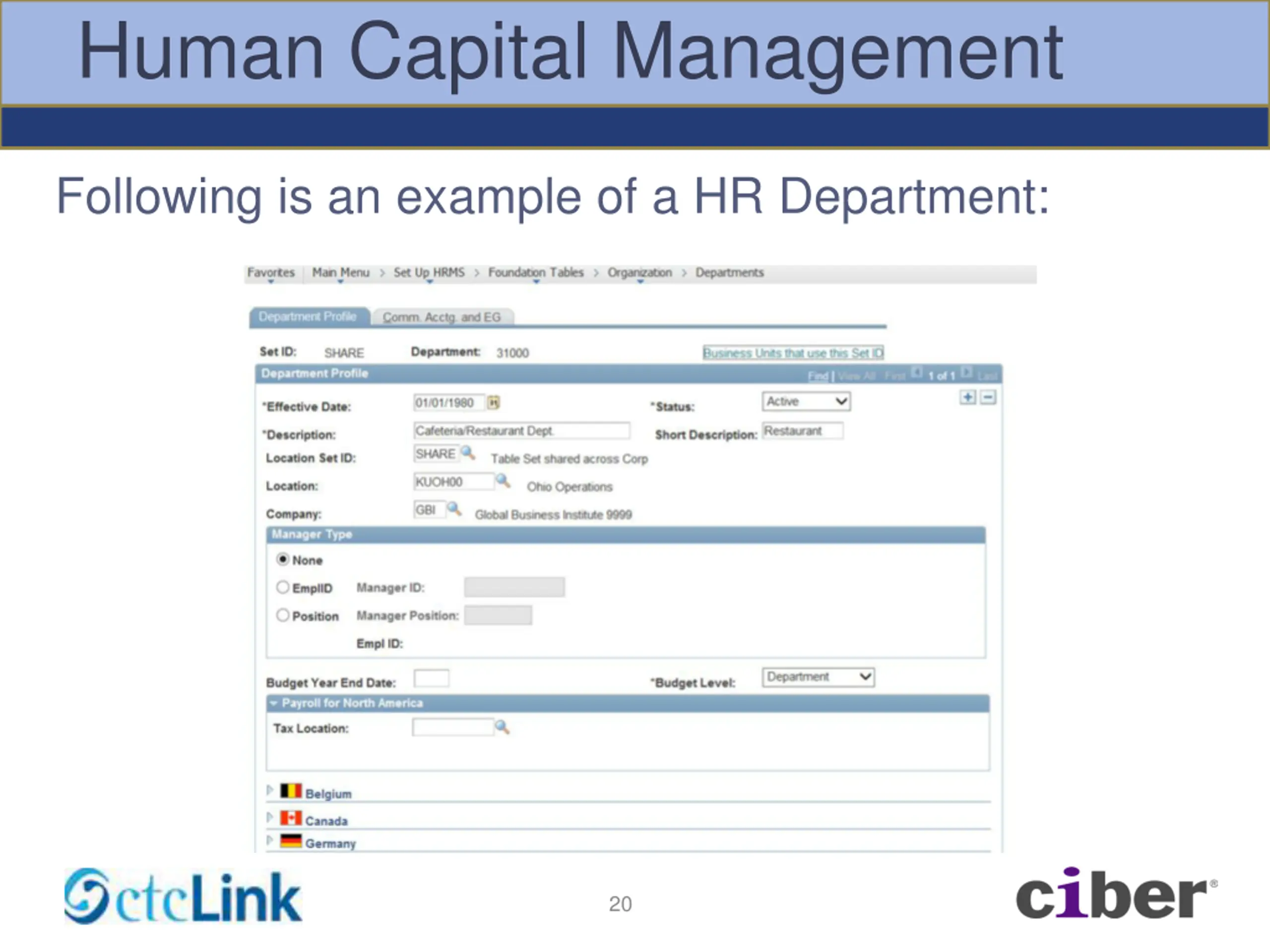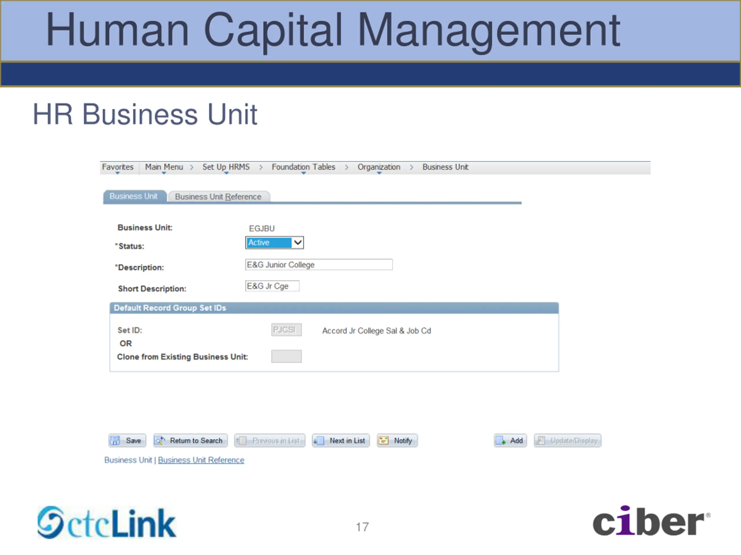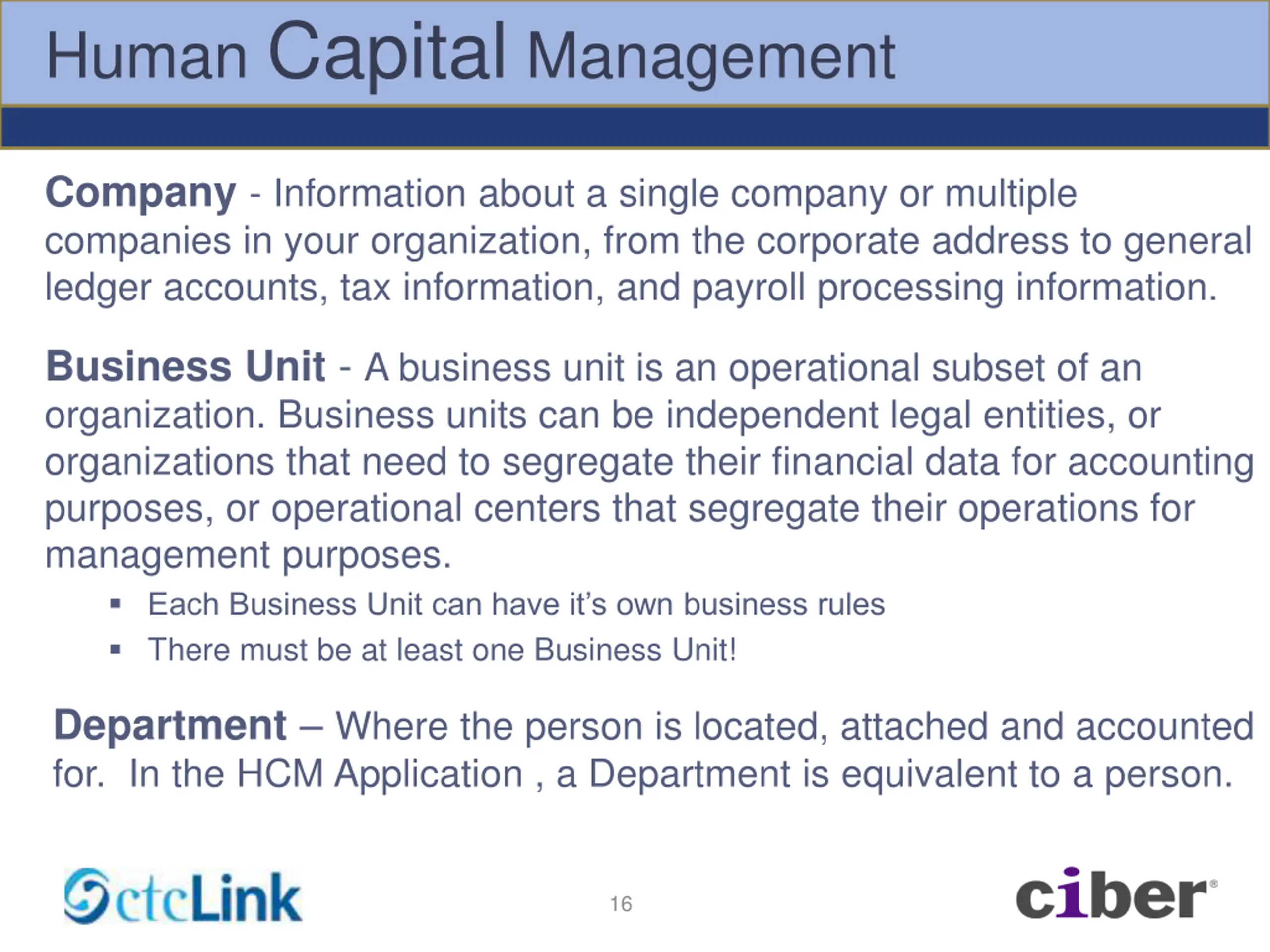 Human Capital Management Company- Information about a single company or multiple companies in your organization, from the corporate address to general ledger accounts, tax information, and payroll processing information. Business Unit - A business unit is an operational subset of an organization. Business units can be independent legal entities, or organizations that need to segregate their financial data for accounting purposes, or operational centers that segregate their operations for management purposes. Each Business Unit can have it s own business rules There must be at least one Business Unit! Department Where the person is located, attached and accounted for. In the HCM Application , a Department is equivalent to a person. 16