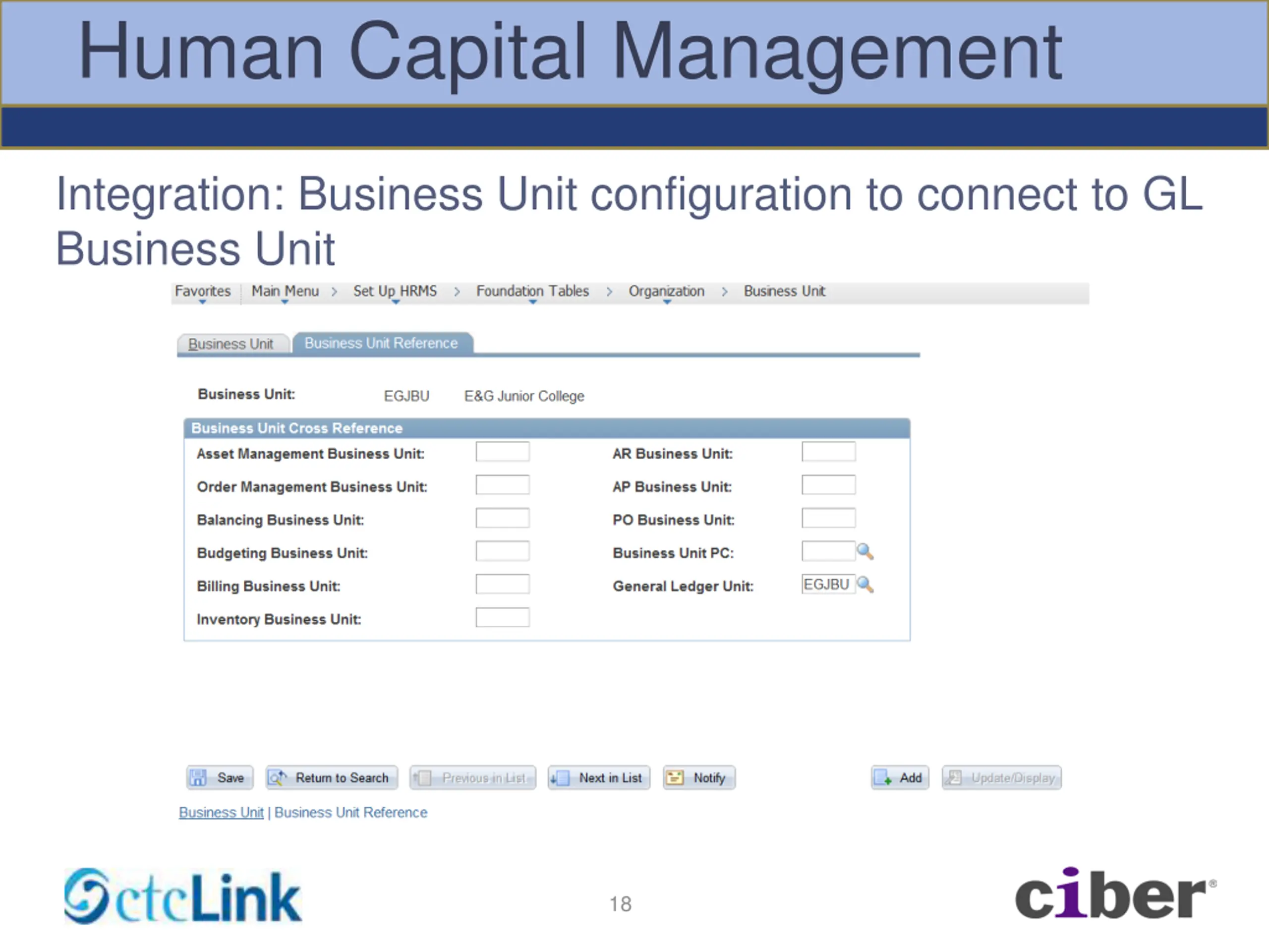Human Capital Management Integration: Business Unit configuration to connect to GL Business Unit 18