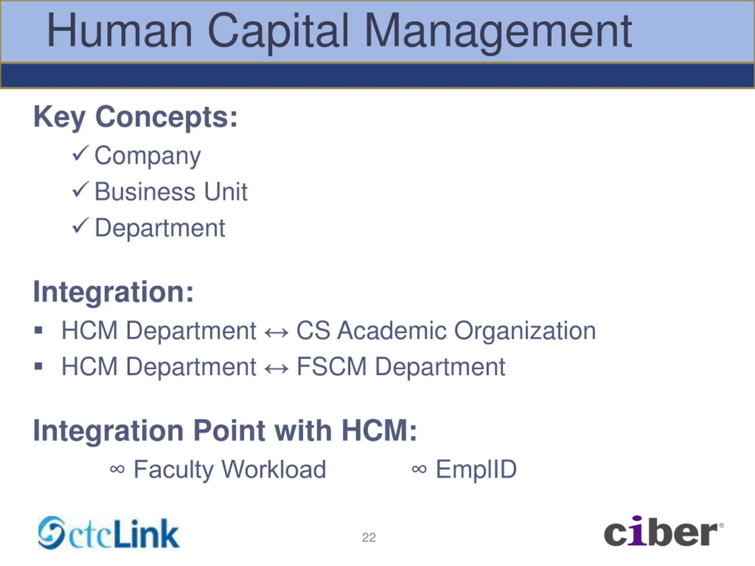 Human Capital Management Key Concepts: Company Business Unit Department Integration: HCM Department HCM Department CS Academic Organization FSCM Department Integration Point with HCM: Faculty Workload EmplID 22