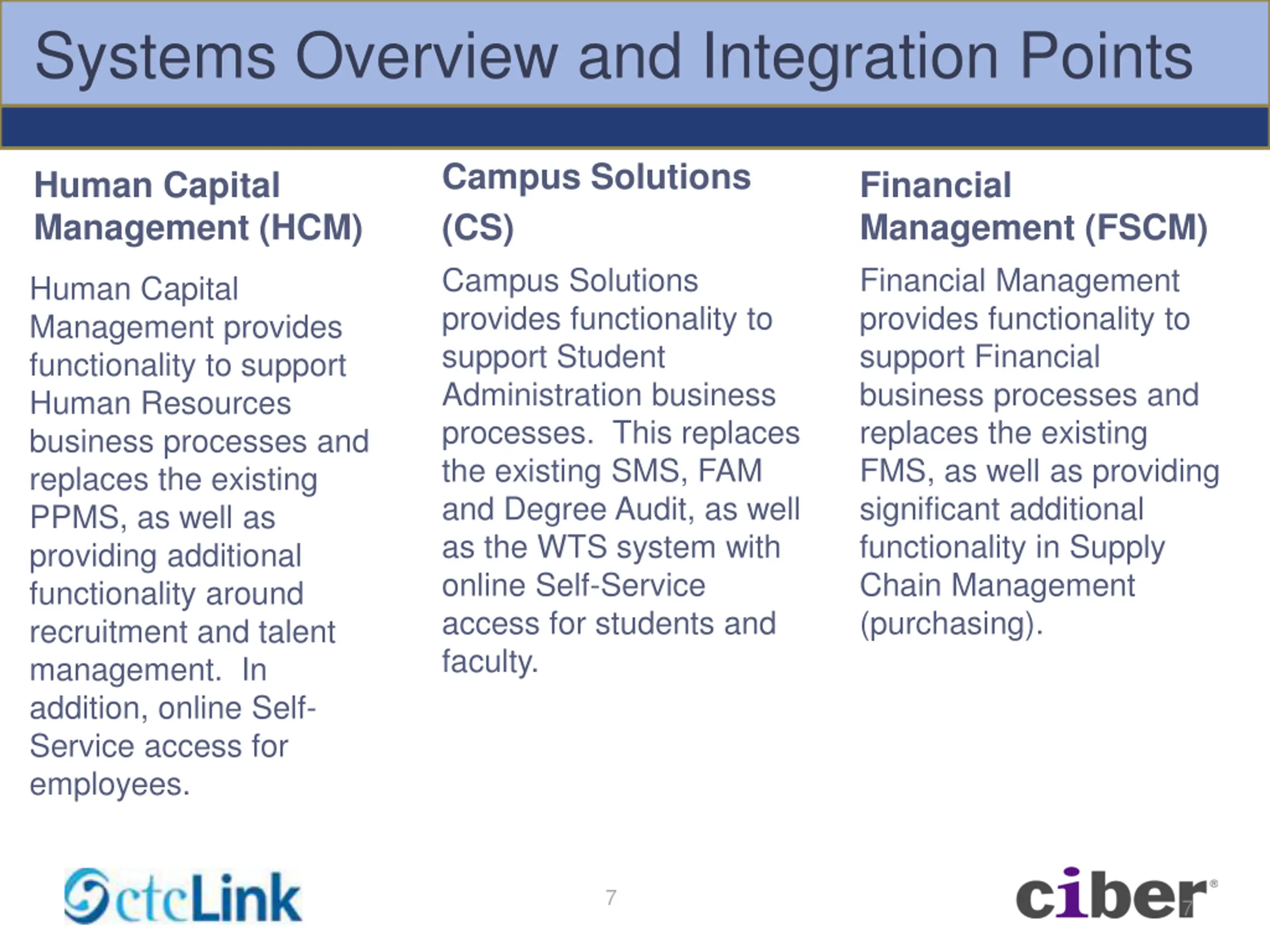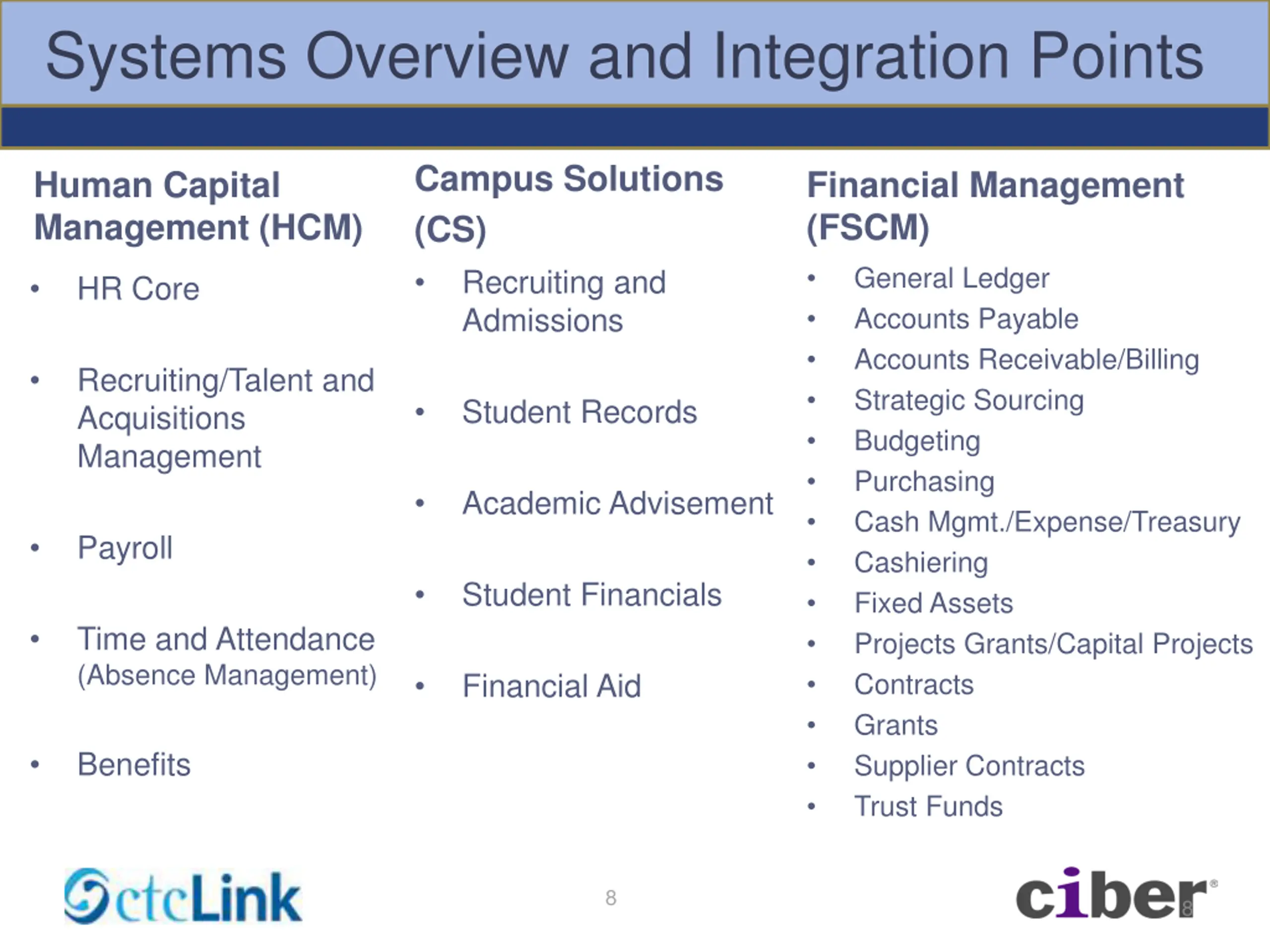 Systems Overview and Integration Points Campus Solutions (CS) Campus Solutions provides functionality to support Student Administration business processes. This replaces the existing SMS, FAM and Degree Audit, as well as the WTS system with online Self-Service access for students and faculty. Human Capital Management (HCM) Financial Management (FSCM) Financial Management provides functionality to support Financial business processes and replaces the existing FMS, as well as providing significant additional functionality in Supply Chain Management (purchasing). Human Capital Management provides functionality to support Human Resources business processes and replaces the existing PPMS, as well as providing additional functionality around recruitment and talent management. In addition, online Self- Service access for employees. 7 7