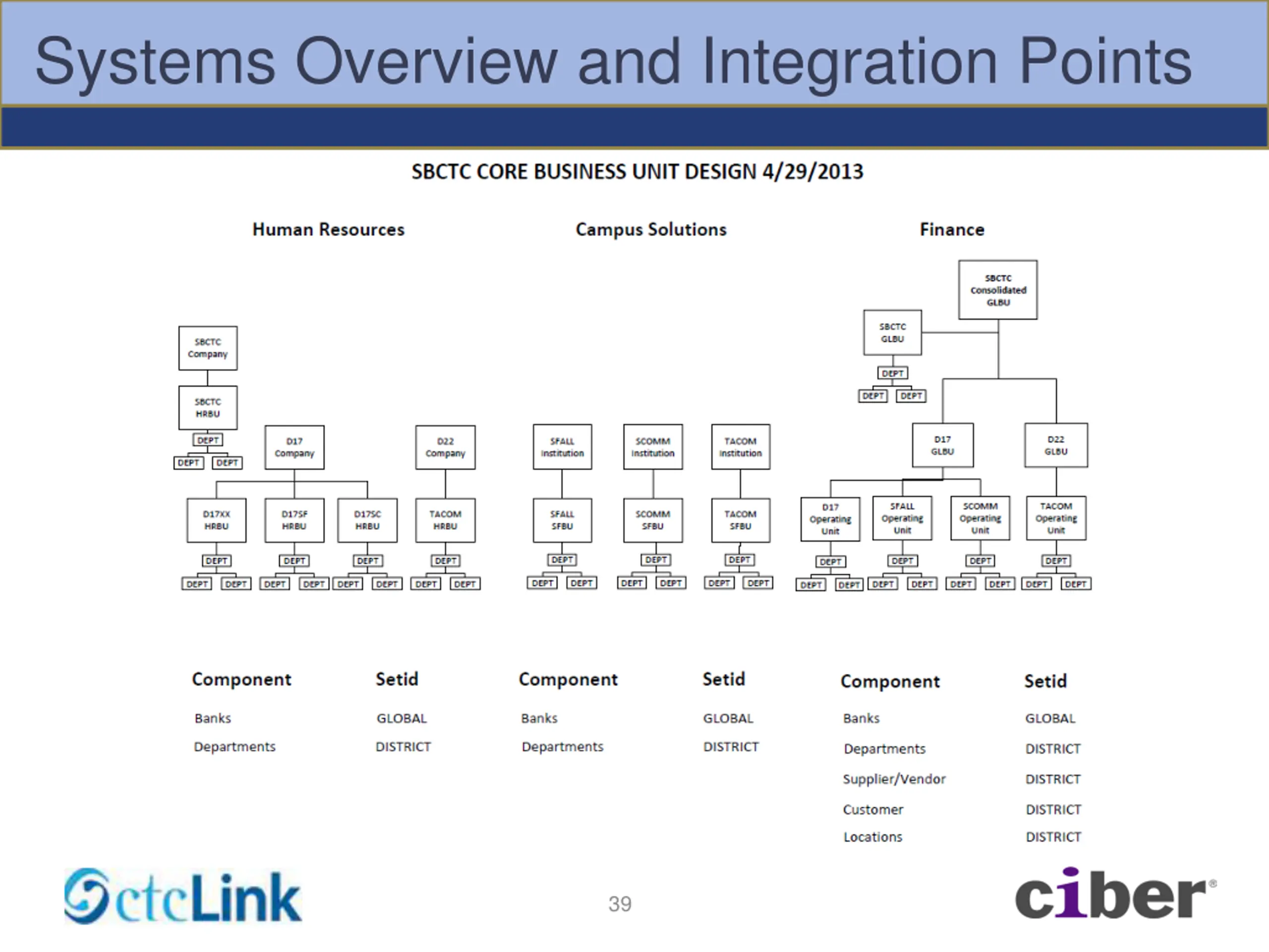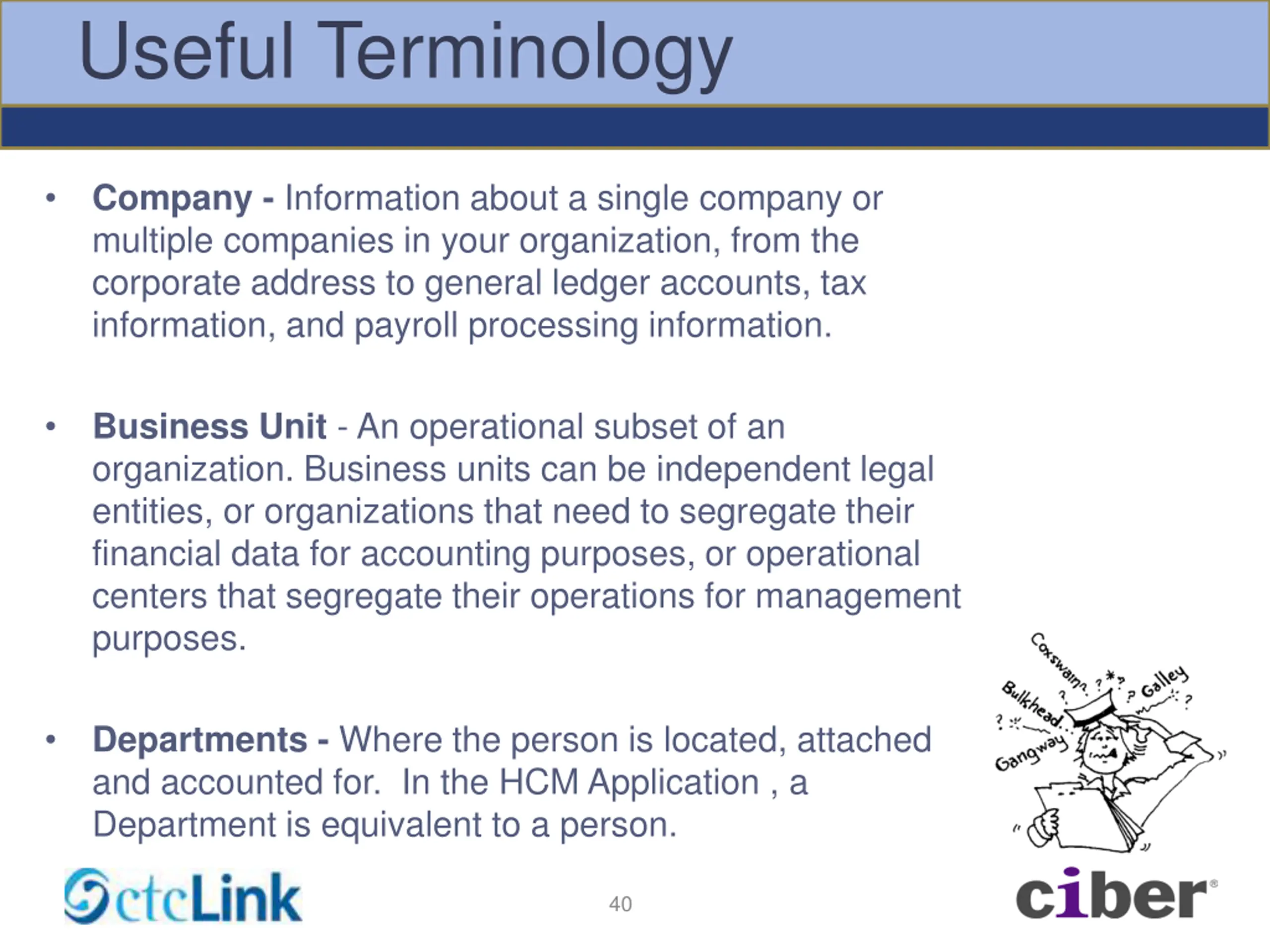 Useful Terminology Company - Information about a single company or multiple companies in your organization, from the corporate address to general ledger accounts, tax information, and payroll processing information. Business Unit - An operational subset of an organization. Business units can be independent legal entities, or organizations that need to segregate their financial data for accounting purposes, or operational centers that segregate their operations for management purposes. Departments - Where the person is located, attached and accounted for. In the HCM Application , a Department is equivalent to a person. 40