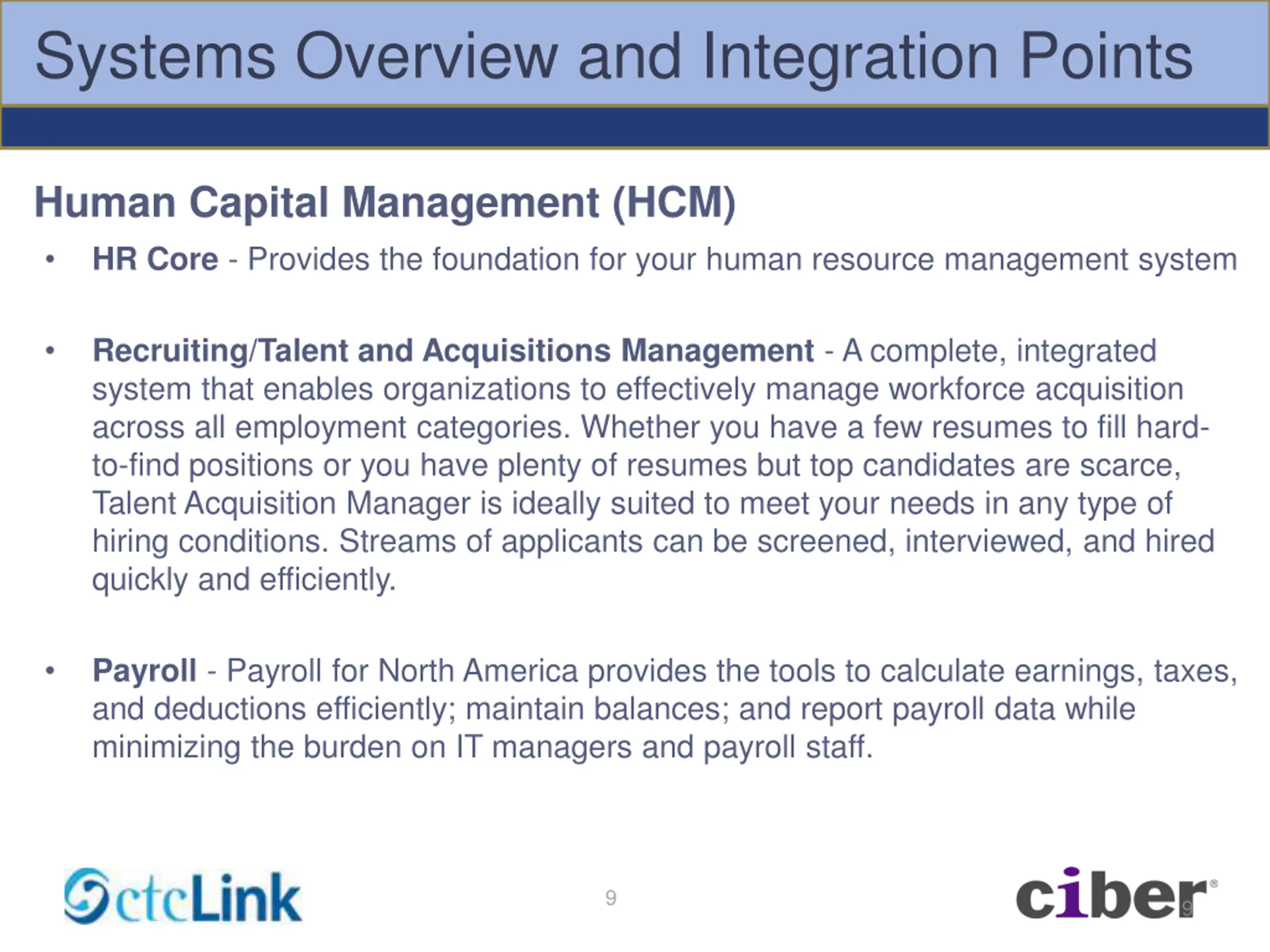 Systems Overview and Integration Points Human Capital Management (HCM) HR Core - Provides the foundation for your human resource management system Recruiting/Talent and Acquisitions Management - A complete, integrated system that enables organizations to effectively manage workforce acquisition across all employment categories. Whether you have a few resumes to fill hard- to-find positions or you have plenty of resumes but top candidates are scarce, Talent Acquisition Manager is ideally suited to meet your needs in any type of hiring conditions. Streams of applicants can be screened, interviewed, and hired quickly and efficiently. Payroll - Payroll for North America provides the tools to calculate earnings, taxes, and deductions efficiently; maintain balances; and report payroll data while minimizing the burden on IT managers and payroll staff. 9 9