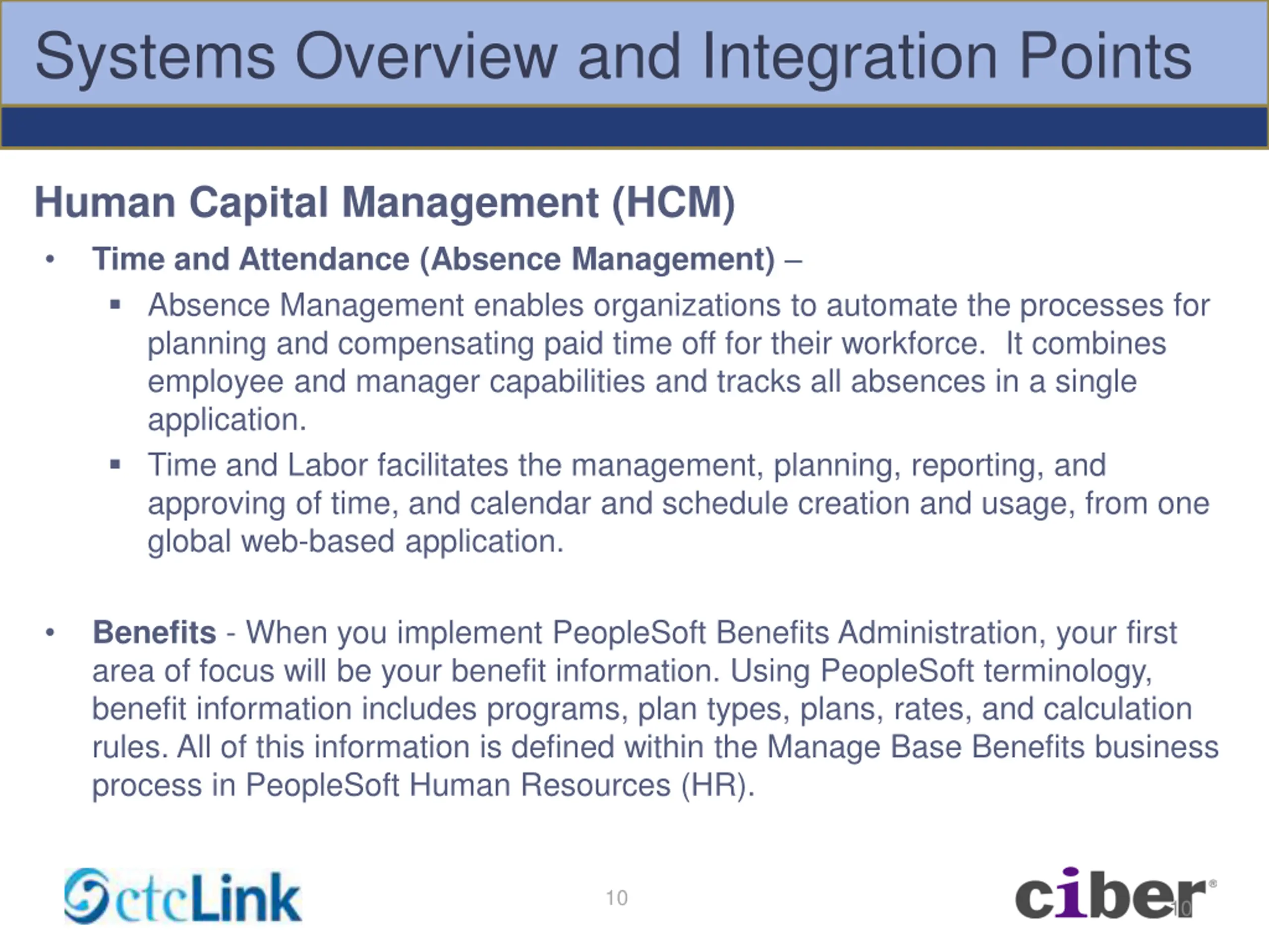 Systems Overview and Integration Points Human Capital Management (HCM) Time and Attendance (Absence Management) Absence Management enables organizations to automate the processes for planning and compensating paid time off for their workforce. It combines employee and manager capabilities and tracks all absences in a single application. Time and Labor facilitates the management, planning, reporting, and approving of time, and calendar and schedule creation and usage, from one global web-based application. Benefits - When you implement PeopleSoft Benefits Administration, your first area of focus will be your benefit information. Using PeopleSoft terminology, benefit information includes programs, plan types, plans, rates, and calculation rules. All of this information is defined within the Manage Base Benefits business process in PeopleSoft Human Resources (HR). 10 10