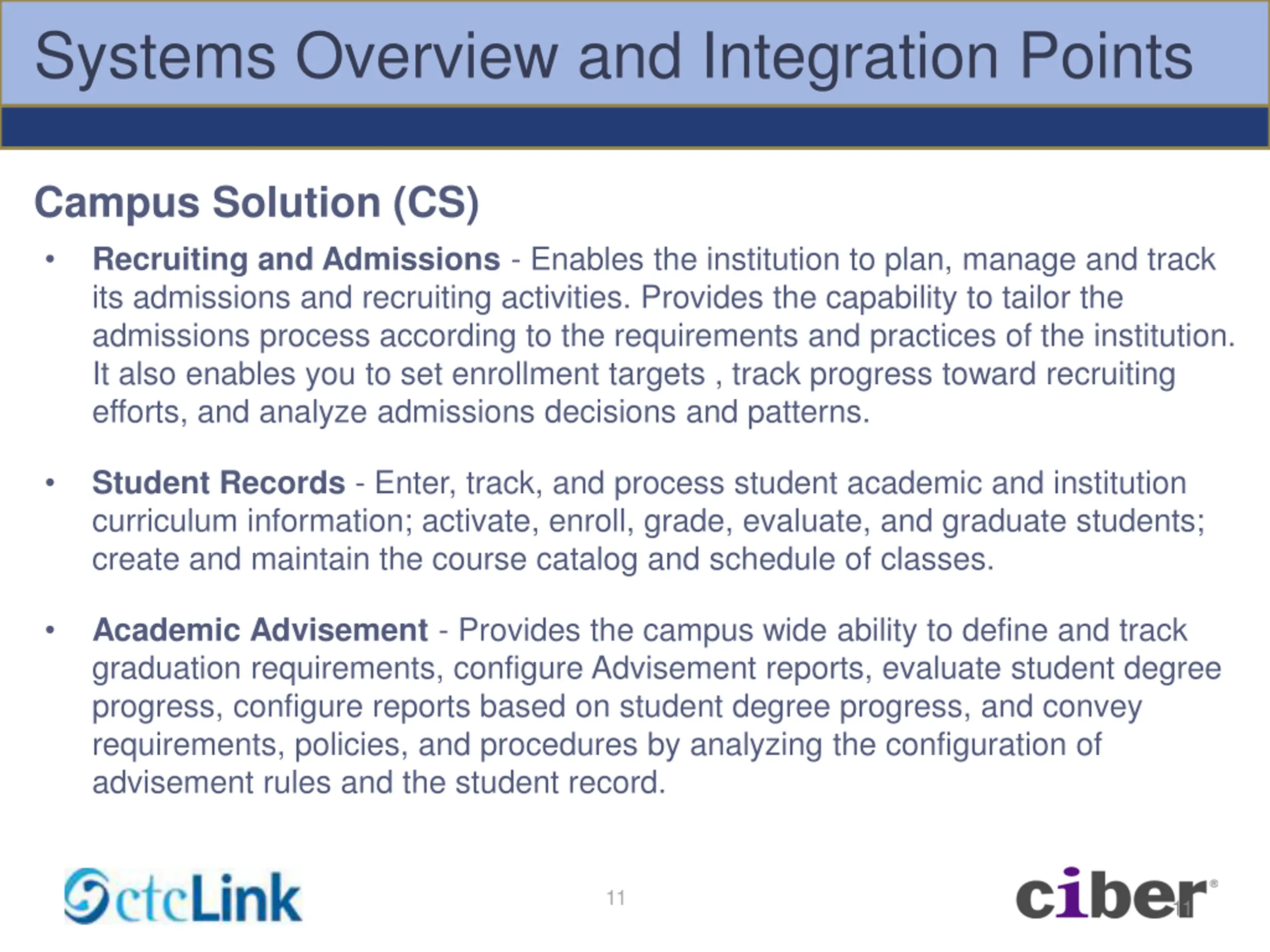 Systems Overview and Integration Points Campus Solution (CS) Recruiting and Admissions - Enables the institution to plan, manage and track its admissions and recruiting activities. Provides the capability to tailor the admissions process according to the requirements and practices of the institution. It also enables you to set enrollment targets , track progress toward recruiting efforts, and analyze admissions decisions and patterns. Student Records - Enter, track, and process student academic and institution curriculum information; activate, enroll, grade, evaluate, and graduate students; create and maintain the course catalog and schedule of classes. Academic Advisement - Provides the campus wide ability to define and track graduation requirements, configure Advisement reports, evaluate student degree progress, configure reports based on student degree progress, and convey requirements, policies, and procedures by analyzing the configuration of advisement rules and the student record. 11 11