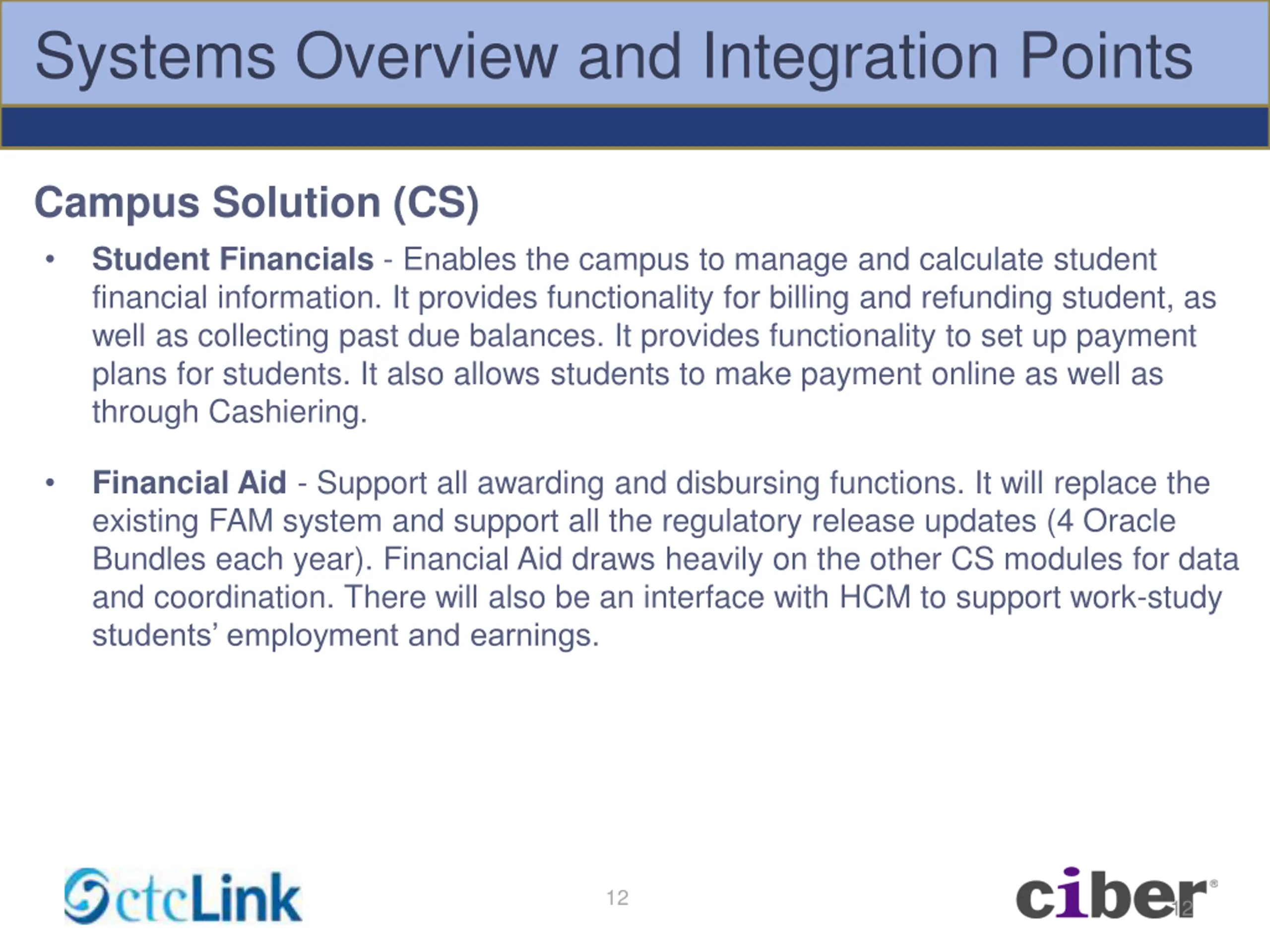 Systems Overview and Integration Points Campus Solution (CS) Student Financials - Enables the campus to manage and calculate student financial information. It provides functionality for billing and refunding student, as well as collecting past due balances. It provides functionality to set up payment plans for students. It also allows students to make payment online as well as through Cashiering. Financial Aid - Support all awarding and disbursing functions. It will replace the existing FAM system and support all the regulatory release updates (4 Oracle Bundles each year). Financial Aid draws heavily on the other CS modules for data and coordination. There will also be an interface with HCM to support work-study students employment and earnings. 12 12