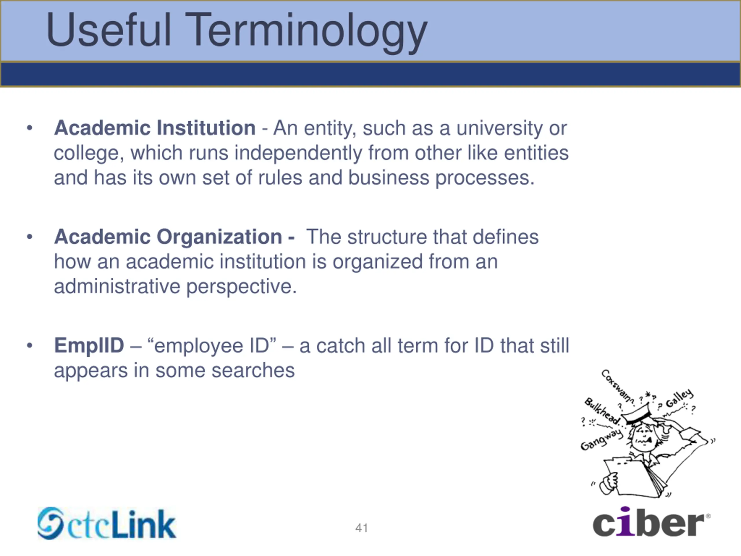 Useful Terminology Academic Institution - An entity, such as a university or college, which runs independently from other like entities and has its own set of rules and business processes. Academic Organization - The structure that defines how an academic institution is organized from an administrative perspective. EmplID employee ID a catch all term for ID that still appears in some searches 41