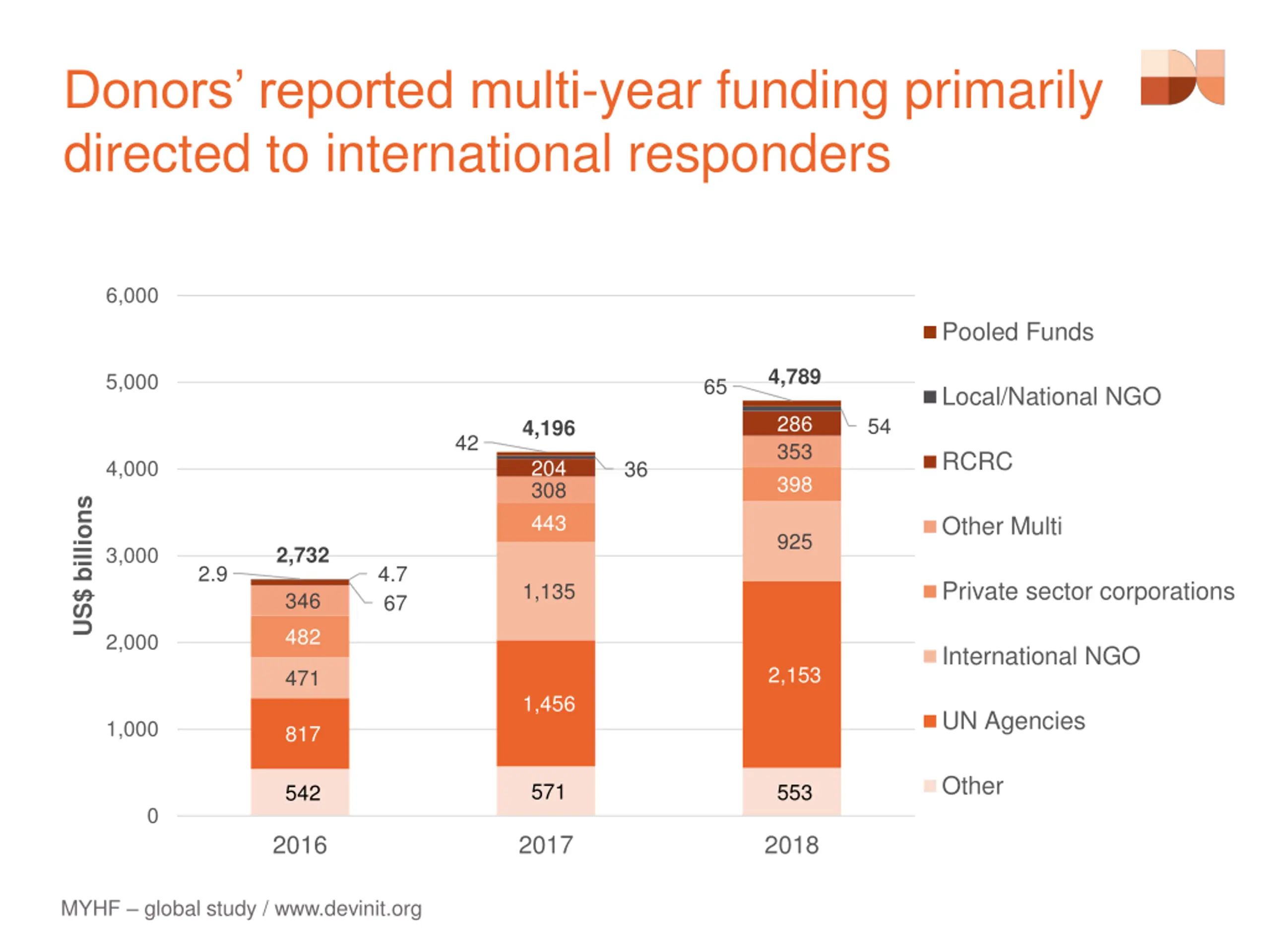Donors reported multi-year funding primarily directed to international responders 6,000 Pooled Funds 4,789 5,000 65 Local/National NGO 286 54 4,196 42 353 RCRC 204 4,000 36 398 308 US$ billions 443 Other Multi 925 2,732 3,000 2.9 4.7 Private sector corporations 1,135 346 67 482 2,000 International NGO 2,153 471 1,456 UN Agencies 1,000 817 Other 571 553 542 0 2016 2017 2018 MYHF global study / www.devinit.org