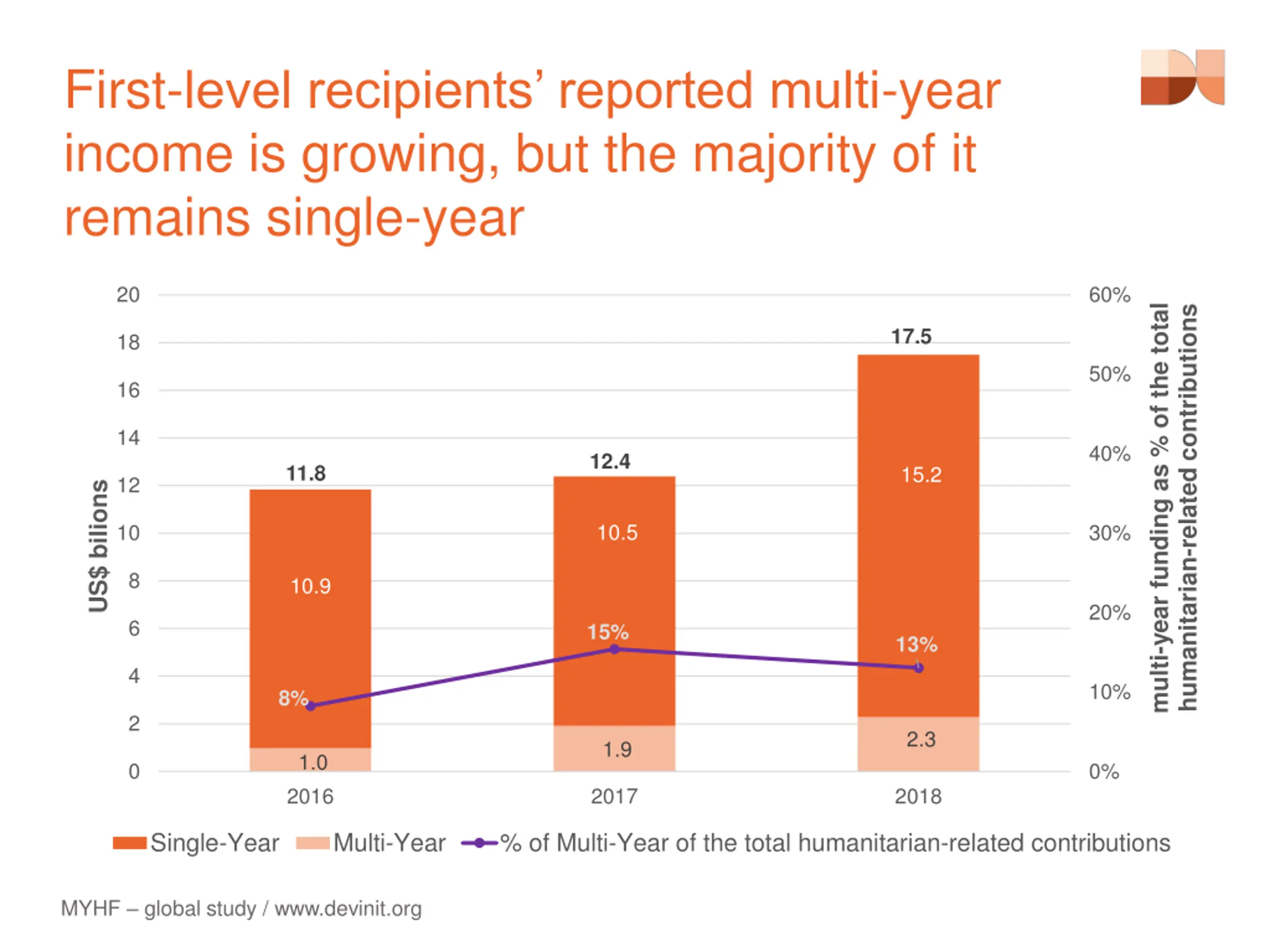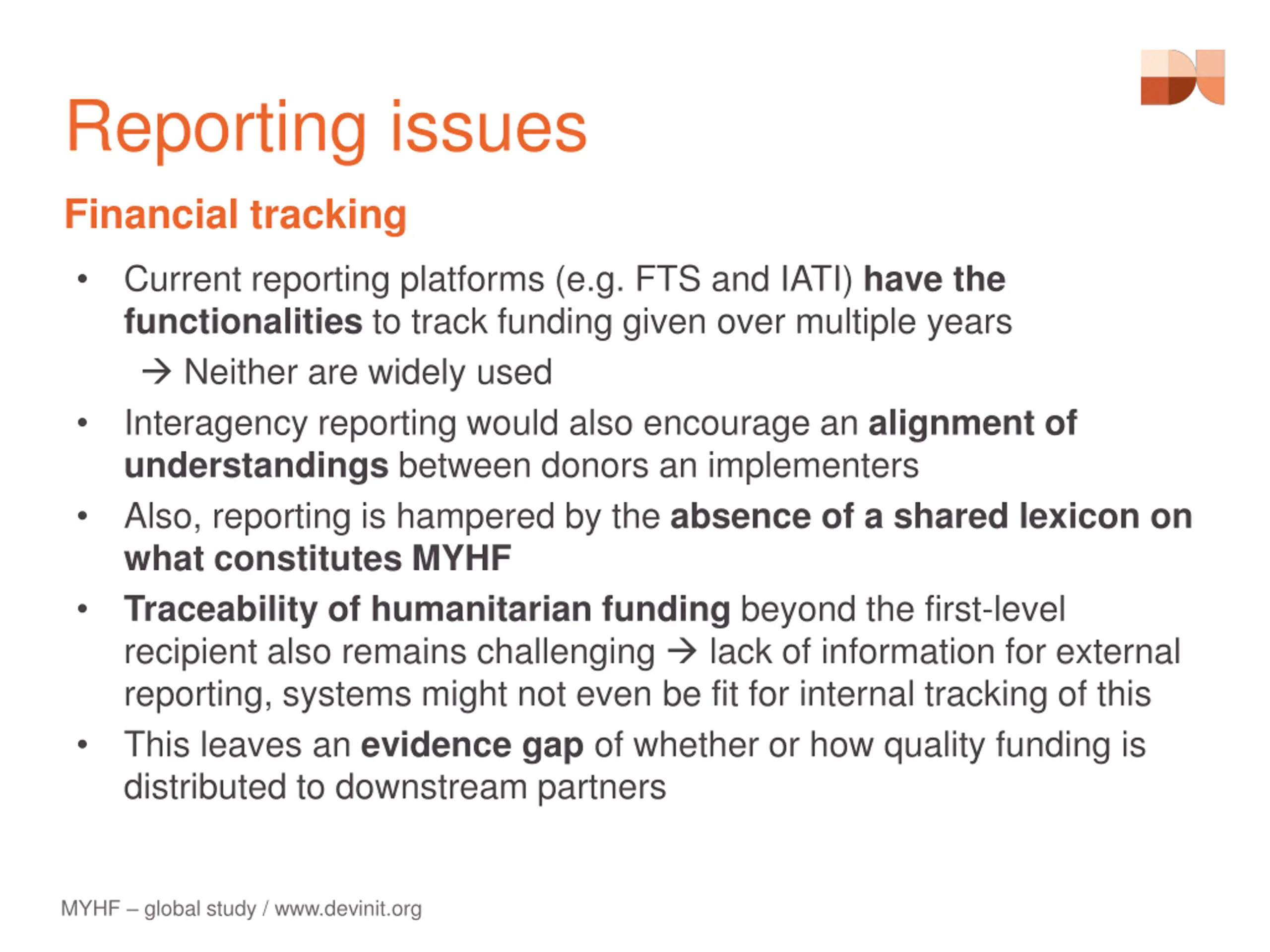 Reporting issues Financial tracking Current reporting platforms (e.g. FTS and IATI) have the functionalities to track funding given over multiple years Neither are widely used Interagency reporting would also encourage an alignment of understandings between donors an implementers Also, reporting is hampered by the absence of a shared lexicon on what constitutes MYHF Traceability of humanitarian funding beyond the first-level recipient also remains challenging lack of information for external reporting, systems might not even be fit for internal tracking of this This leaves an evidence gap of whether or how quality funding is distributed to downstream partners MYHF global study / www.devinit.org