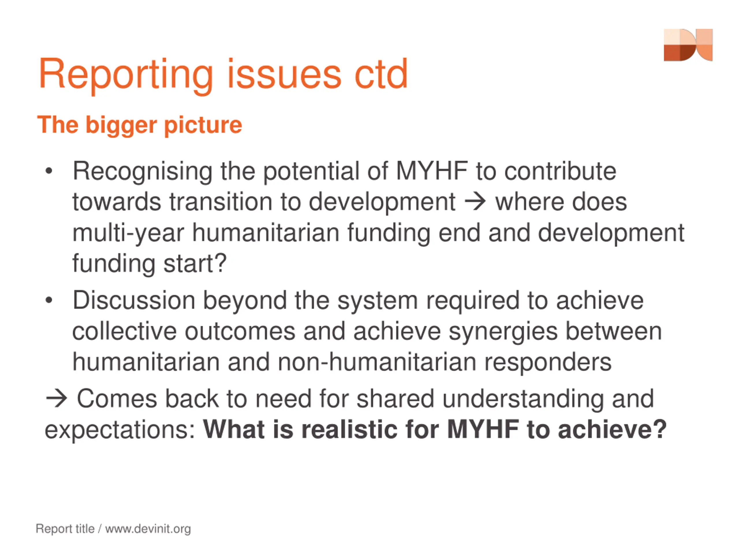 Reporting issues ctd The bigger picture Recognising the potential of MYHF to contribute towards transition to development where does multi-year humanitarian funding end and development funding start? Discussion beyond the system required to achieve collective outcomes and achieve synergies between humanitarian and non-humanitarian responders Comes back to need for shared understanding and expectations: What is realistic for MYHF to achieve? Report title / www.devinit.org
