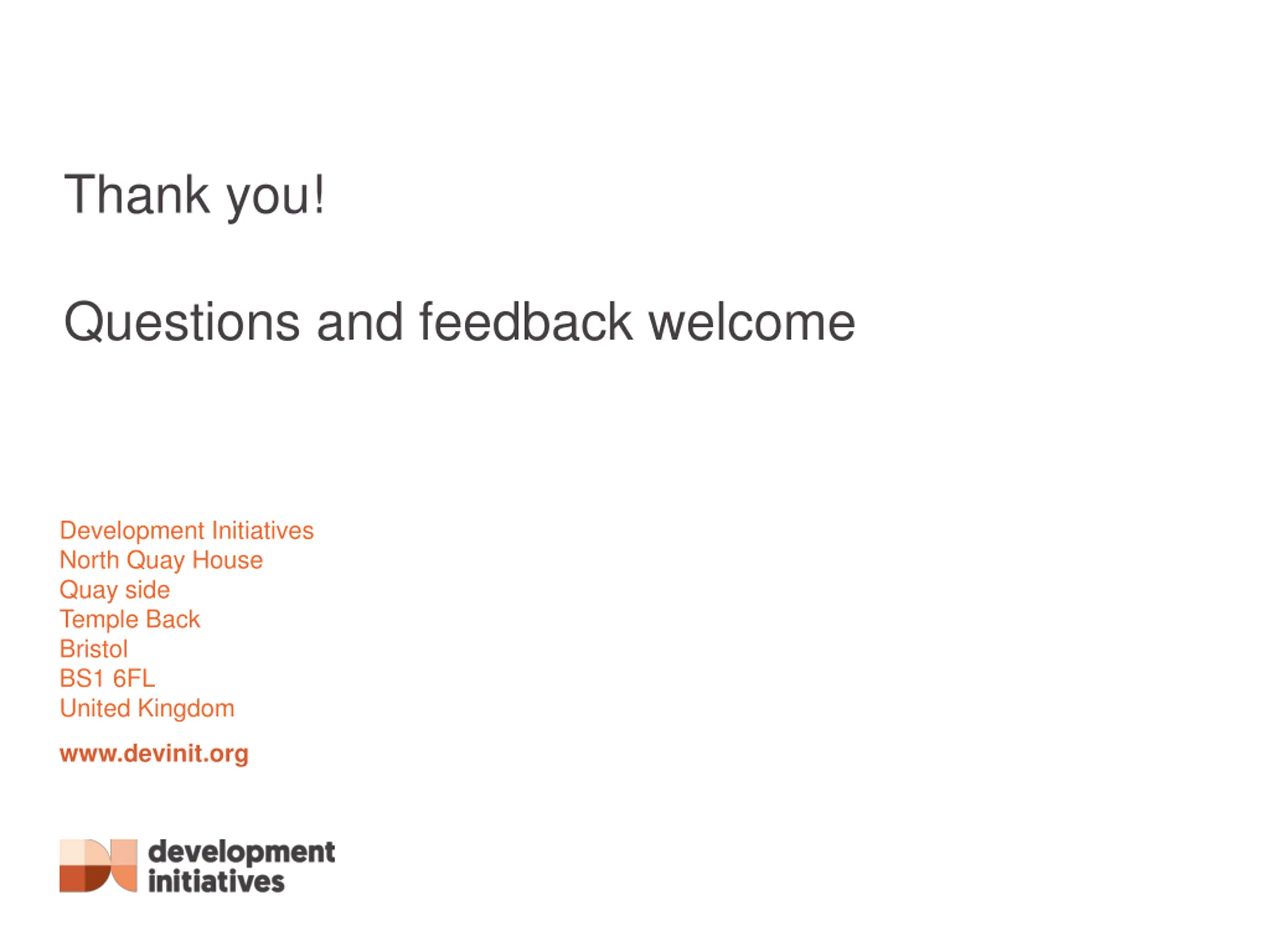 Thank you! Questions and feedback welcome Development Initiatives North Quay House Quay side Temple Back Bristol BS1 6FL United Kingdom www.devinit.org