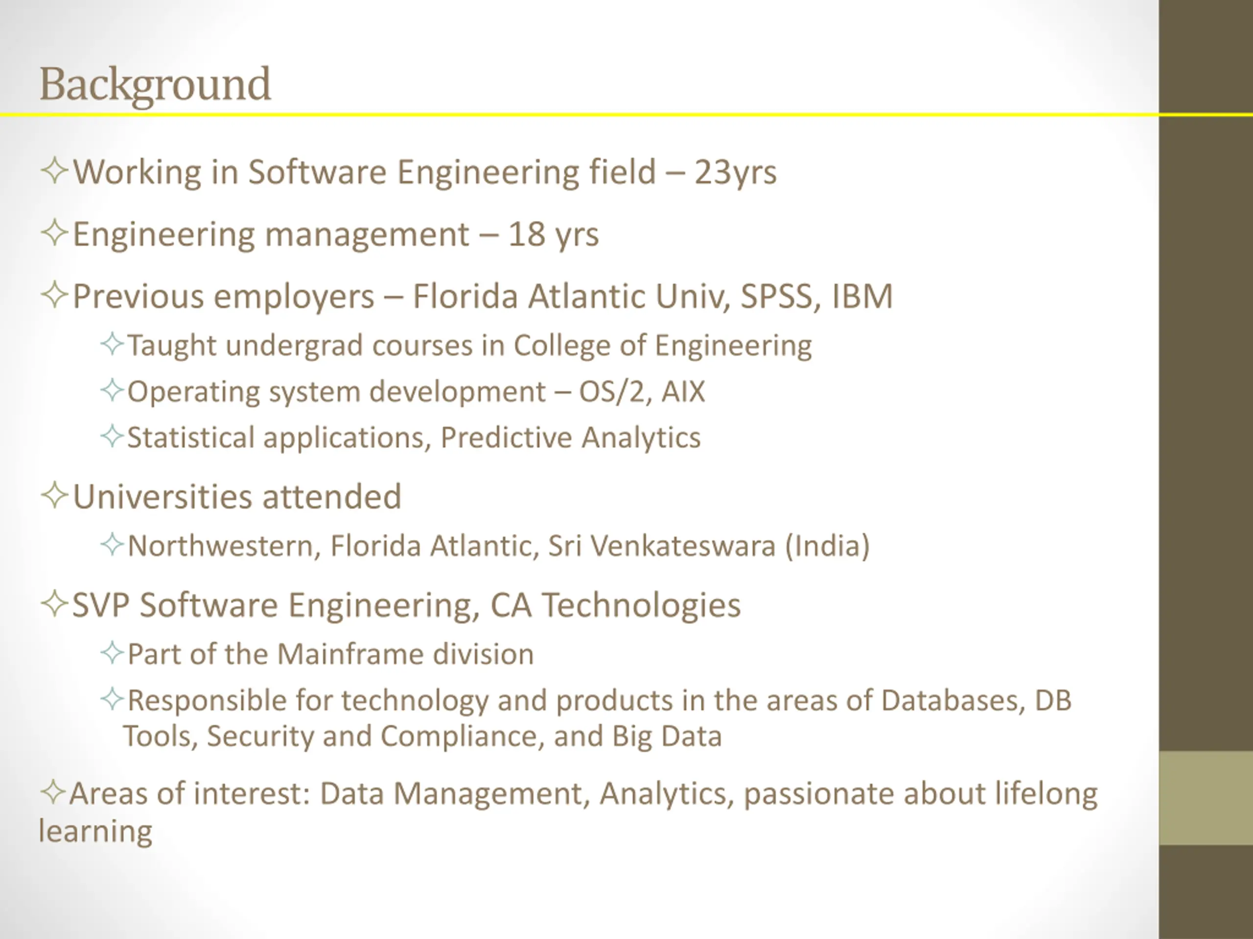 Background Working in Software Engineering field 23yrs Engineering management 18 yrs Previous employers Florida Atlantic Univ, SPSS, IBM Taught undergrad courses in College of Engineering Operating system development OS/2, AIX Statistical applications, Predictive Analytics Universities attended Northwestern, Florida Atlantic, Sri Venkateswara (India) SVP Software Engineering, CA Technologies Part of the Mainframe division Responsible for technology and products in the areas of Databases, DB Tools, Security and Compliance, and Big Data Areas of interest: Data Management, Analytics, passionate about lifelong learning