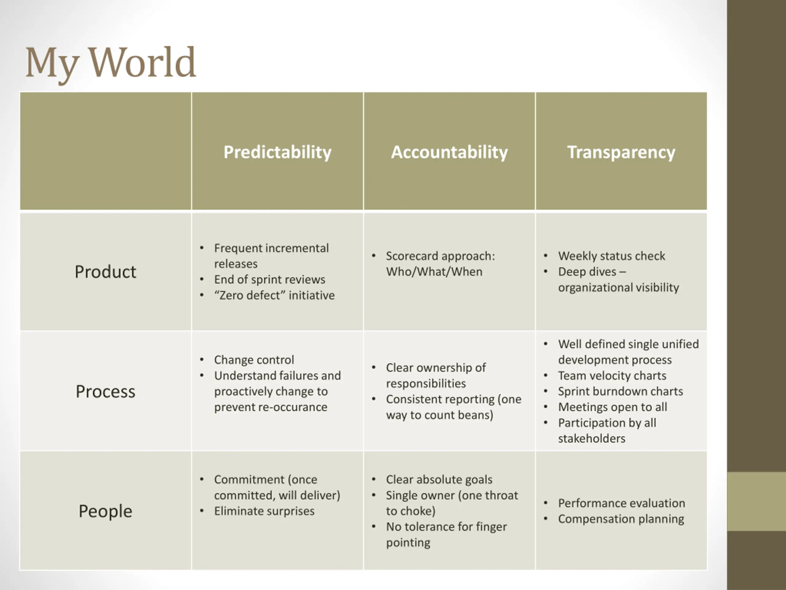 My World Predictability Accountability Transparency Frequent incremental releases End of sprint reviews Zero defect initiative Scorecard approach: Who/What/When Weekly status check Deep dives organizational visibility Product Well defined single unified development process Team velocity charts Sprint burndown charts Meetings open to all Participation by all stakeholders Change control Understand failures and proactively change to prevent re-occurance Clear ownership of responsibilities Consistent reporting (one way to count beans) Process Commitment (once committed, will deliver) Eliminate surprises Clear absolute goals Single owner (one throat to choke) No tolerance for finger pointing Performance evaluation Compensation planning People