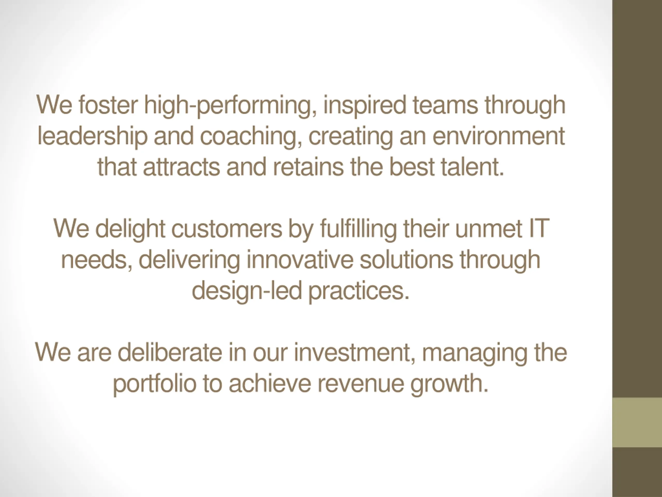 We foster high-performing, inspired teams through leadership and coaching, creating an environment that attracts and retains the best talent. We delight customers by fulfilling their unmet IT needs, delivering innovative solutions through design-led practices. We are deliberate in our investment, managing the portfolio to achieve revenue growth.