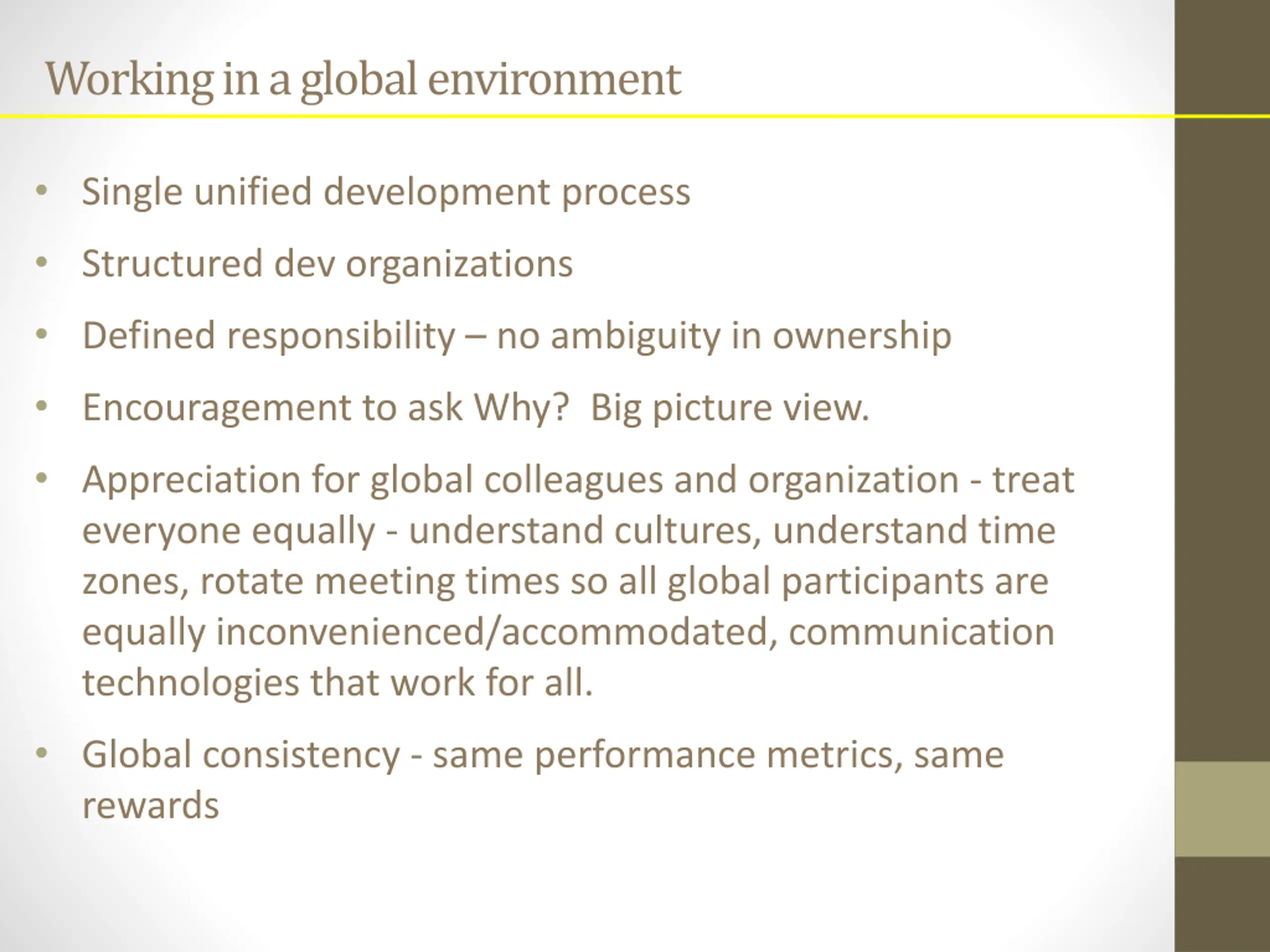 Working in a global environment Single unified development process Structured dev organizations Defined responsibility no ambiguity in ownership Encouragement to ask Why? Big picture view. Appreciation for global colleagues and organization - treat everyone equally - understand cultures, understand time zones, rotate meeting times so all global participants are equally inconvenienced/accommodated, communication technologies that work for all. Global consistency - same performance metrics, same rewards