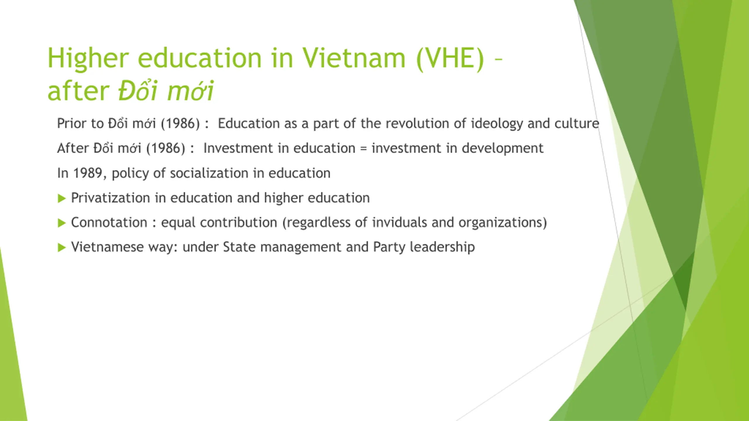 Higher education in Vietnam (VHE) after i m i Prior to i m i (1986) : Education as a part of the revolution of ideology and culture After i m i (1986) : Investment in education = investment in development In 1989, policy of socialization in education Privatization in education and higher education Connotation : equal contribution (regardless of inviduals and organizations) Vietnamese way: under State management and Party leadership