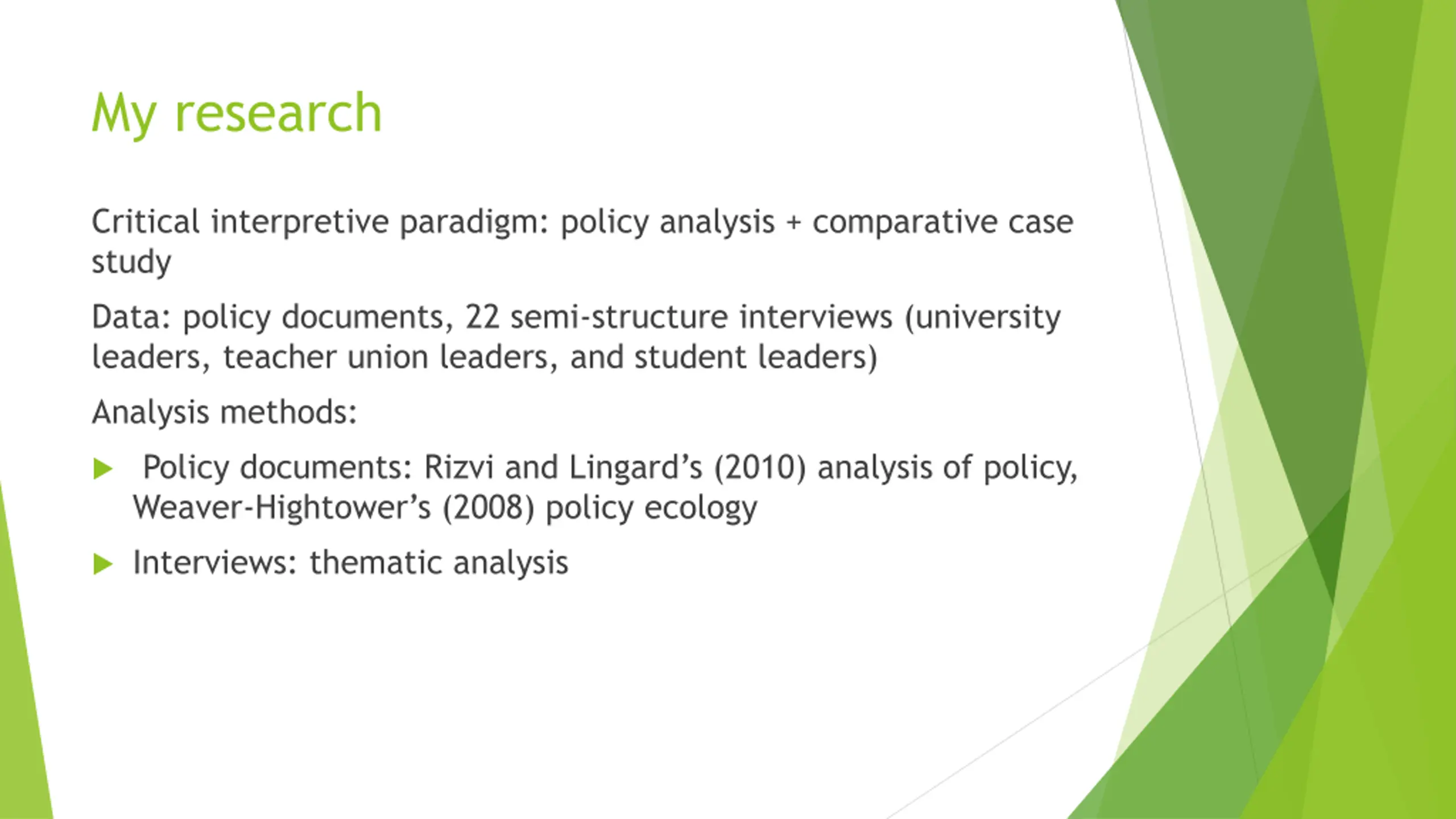 My research Critical interpretive paradigm: policy analysis + comparative case study Data: policy documents, 22 semi-structure interviews (university leaders, teacher union leaders, and student leaders) Analysis methods: Policy documents: Rizvi and Lingard s (2010) analysis of policy, Weaver-Hightower s (2008) policy ecology Interviews: thematic analysis