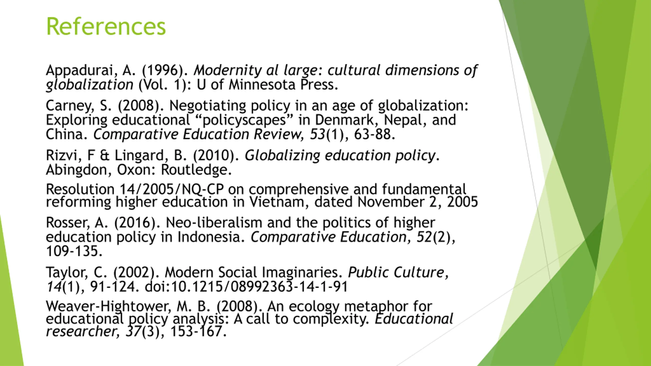 References Appadurai, A. (1996). Modernity al large: cultural dimensions of globalization (Vol. 1): U of Minnesota Press. Carney, S. (2008). Negotiating policy in an age of globalization: Exploring educational policyscapes in Denmark, Nepal, and China. Comparative Education Review, 53(1), 63-88. Rizvi, F & Lingard, B. (2010). Globalizing education policy. Abingdon, Oxon: Routledge. Resolution 14/2005/NQ-CP on comprehensive and fundamental reforming higher education in Vietnam, dated November 2, 2005 Rosser, A. (2016). Neo-liberalism and the politics of higher education policy in Indonesia. Comparative Education, 52(2), 109-135. Taylor, C. (2002). Modern Social Imaginaries. Public Culture, 14(1), 91-124. doi:10.1215/08992363-14-1-91 Weaver-Hightower, M. B. (2008). An ecology metaphor for educational policy analysis: A call to complexity. Educational researcher, 37(3), 153-167.
