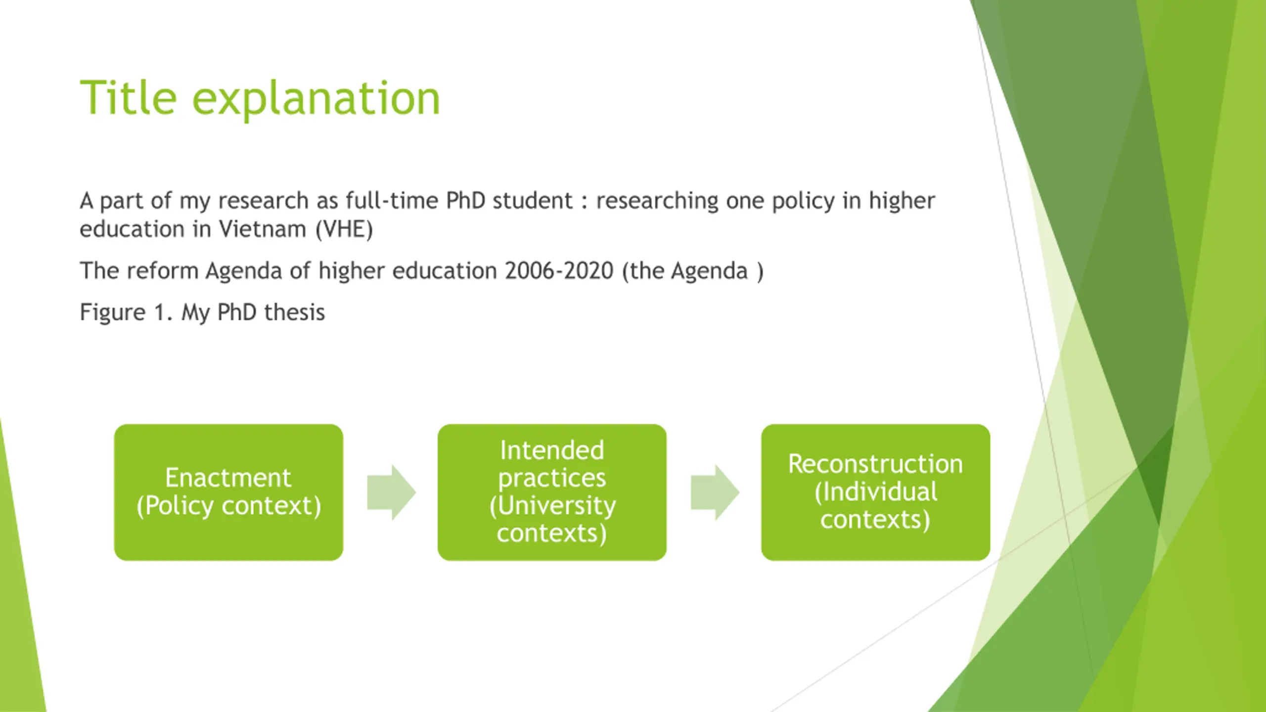Title explanation A part of my research as full-time PhD student : researching one policy in higher education in Vietnam (VHE) The reform Agenda of higher education 2006-2020 (the Agenda ) Figure 1. My PhD thesis Intended practices (University contexts) Reconstruction (Individual contexts) Enactment (Policy context)