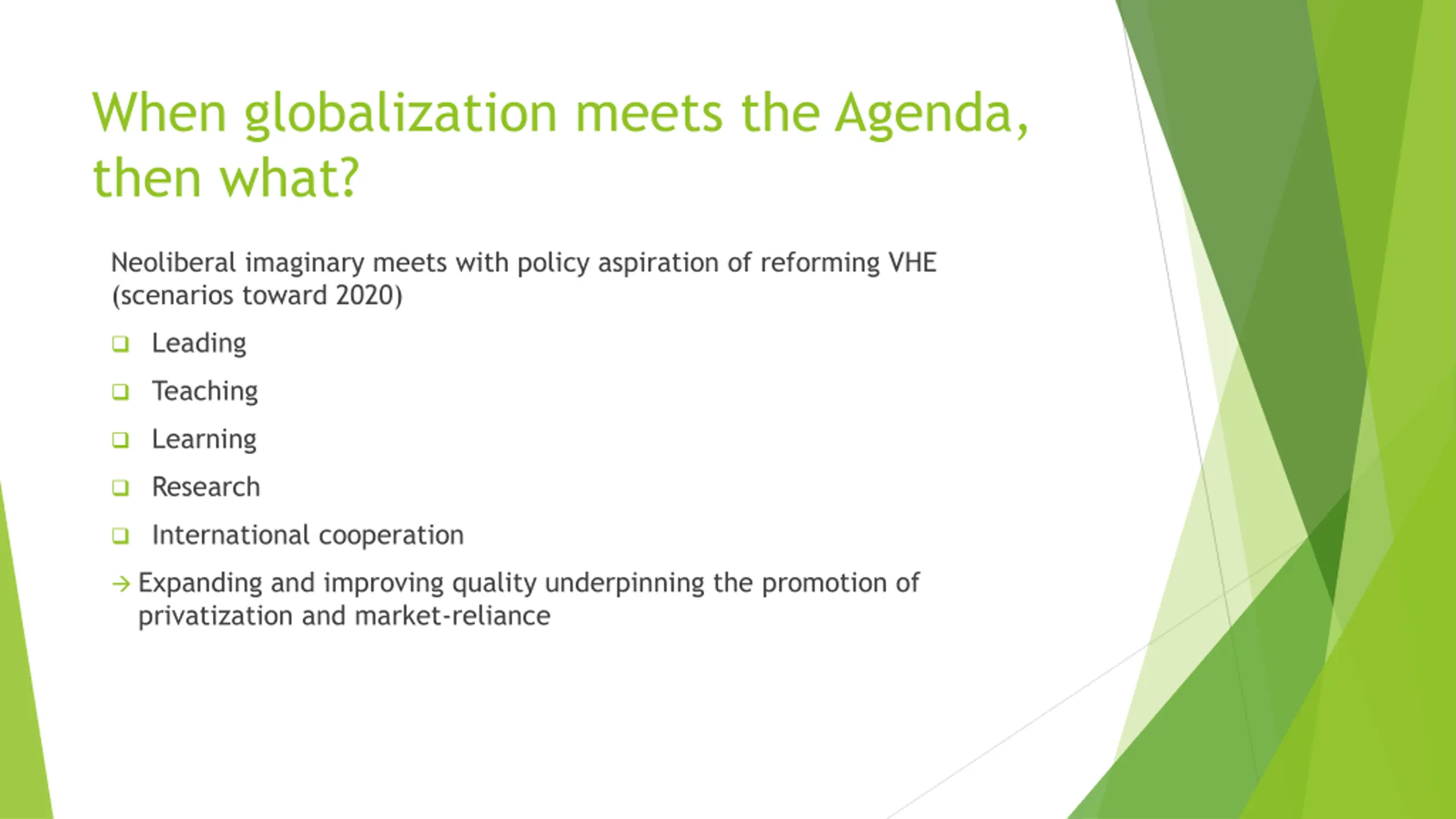 When globalization meets the Agenda, then what? Neoliberal imaginary meets with policy aspiration of reforming VHE (scenarios toward 2020) Leading Teaching Learning Research International cooperation Expanding and improving quality underpinning the promotion of privatization and market-reliance