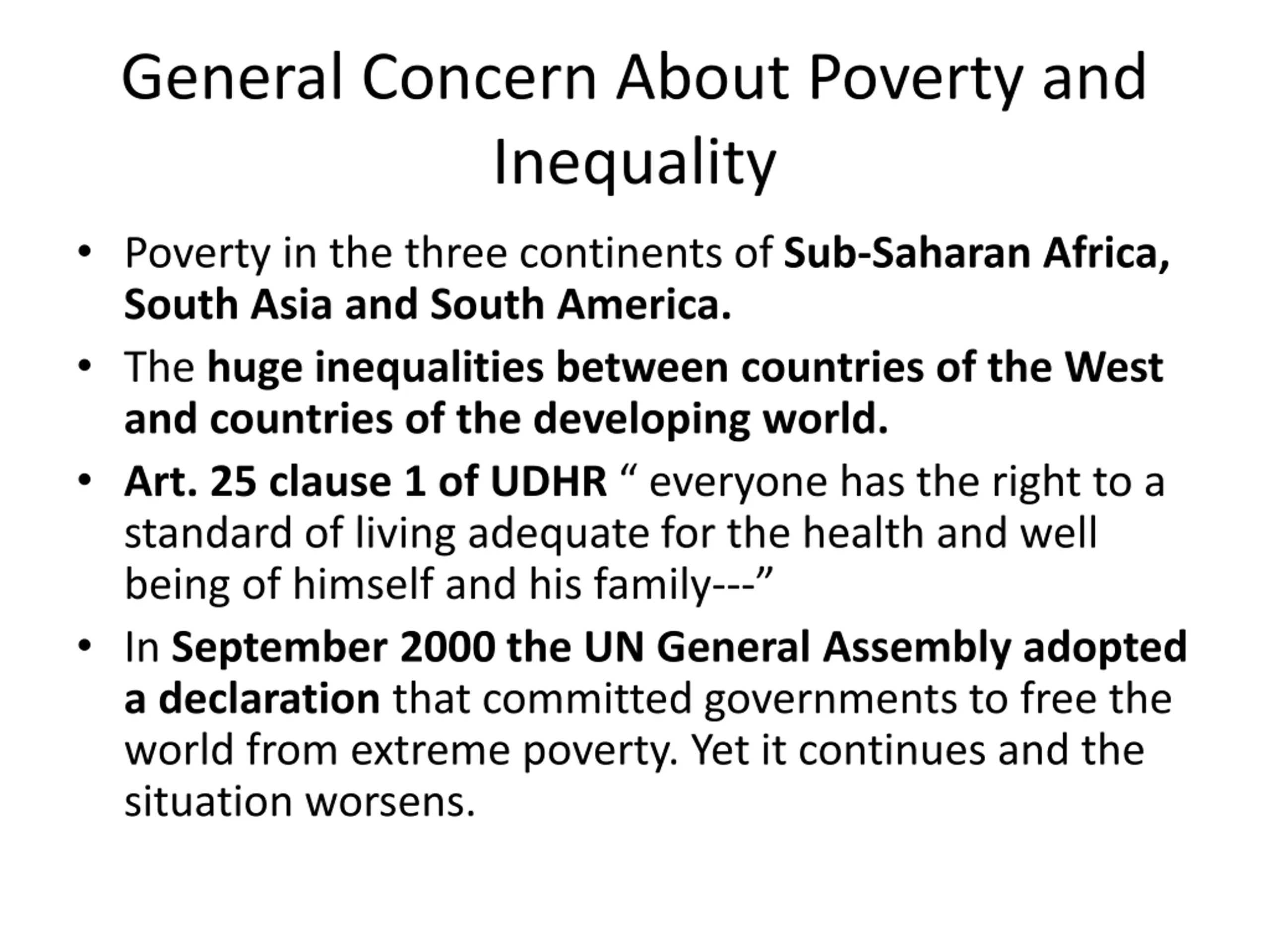 General Concern About Poverty and Inequality Poverty in the three continents of Sub-Saharan Africa, South Asia and South America. The huge inequalities between countries of the West and countries of the developing world. Art. 25 clause 1 of UDHR everyone has the right to a standard of living adequate for the health and well being of himself and his family--- In September 2000 the UN General Assembly adopted a declaration that committed governments to free the world from extreme poverty. Yet it continues and the situation worsens.