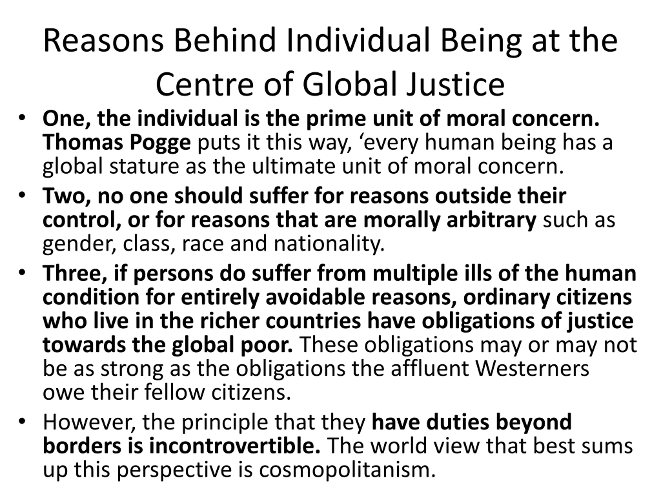 Reasons Behind Individual Being at the Centre of Global Justice One, the individual is the prime unit of moral concern. Thomas Pogge puts it this way, every human being has a global stature as the ultimate unit of moral concern. Two, no one should suffer for reasons outside their control, or for reasons that are morally arbitrary such as gender, class, race and nationality. Three, if persons do suffer from multiple ills of the human condition for entirely avoidable reasons, ordinary citizens who live in the richer countries have obligations of justice towards the global poor. These obligations may or may not be as strong as the obligations the affluent Westerners owe their fellow citizens. However, the principle that they have duties beyond borders is incontrovertible. The world view that best sums up this perspective is cosmopolitanism.