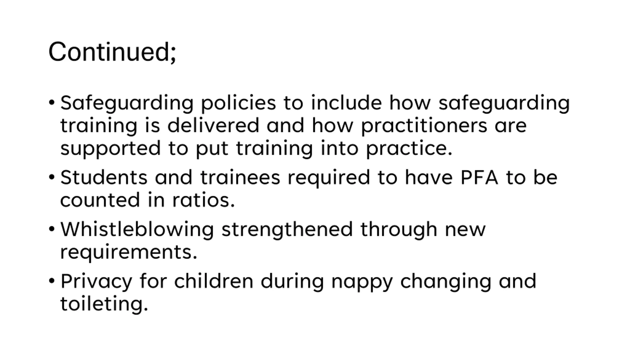 Continued; Safeguarding policies to include how safeguarding training is delivered and how practitioners are supported to put training into practice. Students and trainees required to have PFA to be counted in ratios. Whistleblowing strengthened through new requirements. Privacy for children during nappy changing and toileting.
