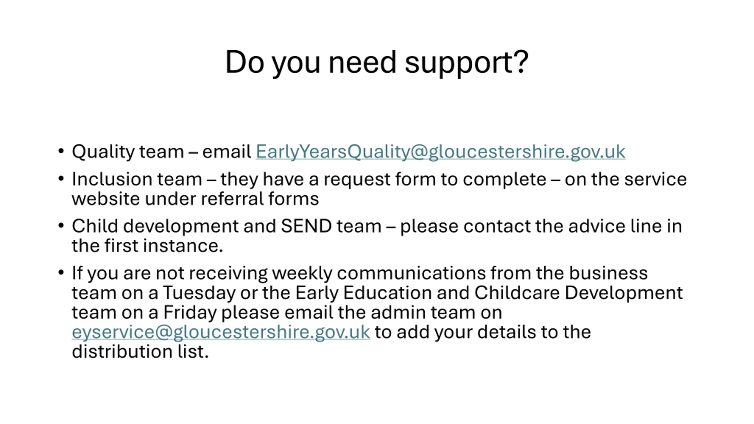 Do you need support? Quality team email EarlyYearsQuality@gloucestershire.gov.uk Inclusion team they have a request form to complete on the service website under referral forms Child development and SEND team please contact the advice line in the first instance. If you are not receiving weekly communications from the business team on a Tuesday or the Early Education and Childcare Development team on a Friday please email the admin team on eyservice@gloucestershire.gov.uk to add your details to the distribution list.