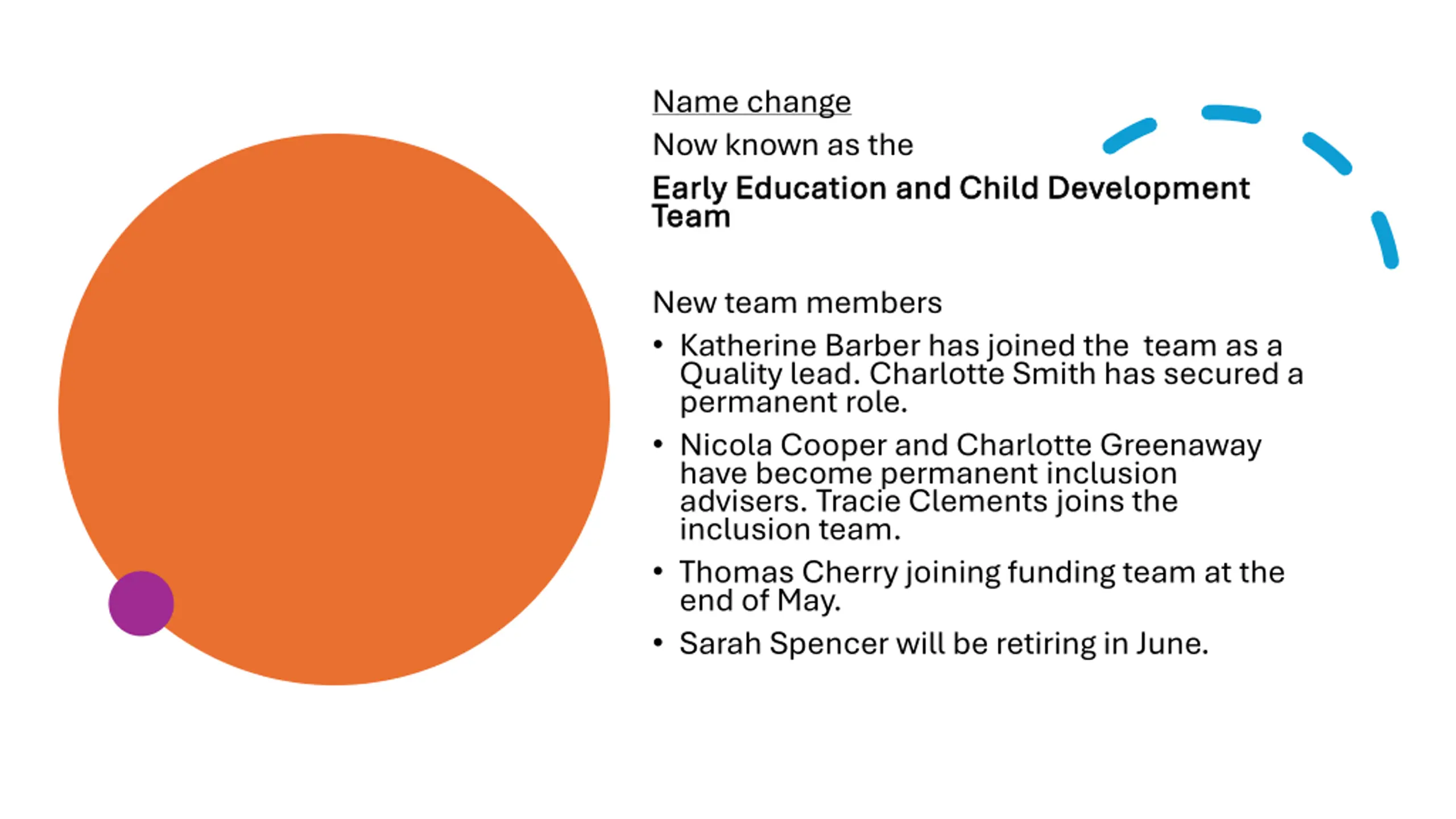 Name change Now known as the Early Education and Child Development Early Education and Child Development Team Team New team members Katherine Barber has joined the team as a Quality lead. Charlotte Smith has secured a permanent role. Nicola Cooper and Charlotte Greenaway have become permanent inclusion advisers. Tracie Clements joins the inclusion team. Thomas Cherry joining funding team at the end of May. Sarah Spencer will be retiring in June.