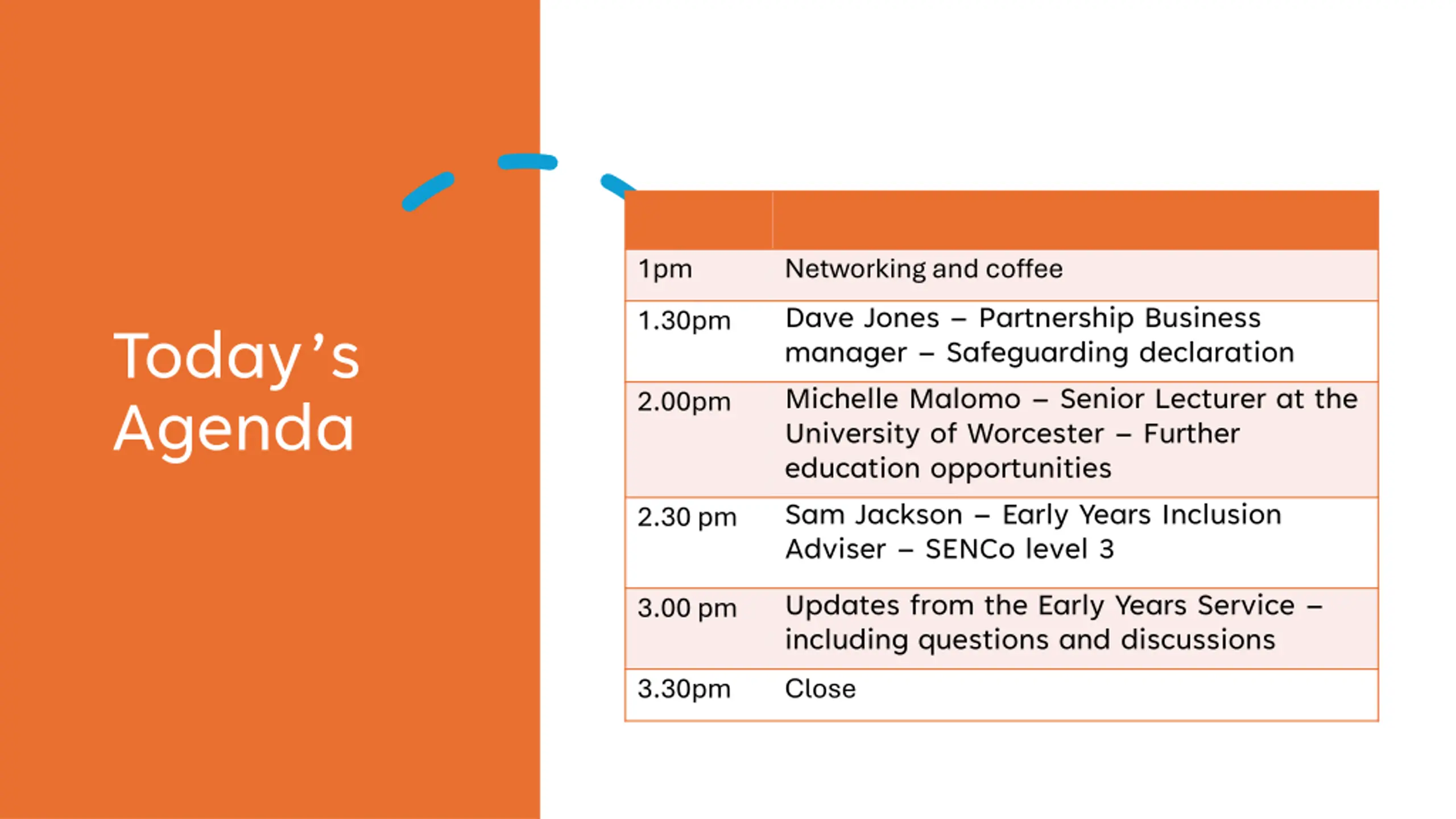 1pm Networking and coffee Dave Jones Partnership Business manager Safeguarding declaration Michelle Malomo Senior Lecturer at the University of Worcester Further education opportunities Sam Jackson Early Years Inclusion Adviser SENCo level 3 Updates from the Early Years Service including questions and discussions Close 1.30pm Today s Agenda 2.00pm 2.30 pm 3.00 pm 3.30pm