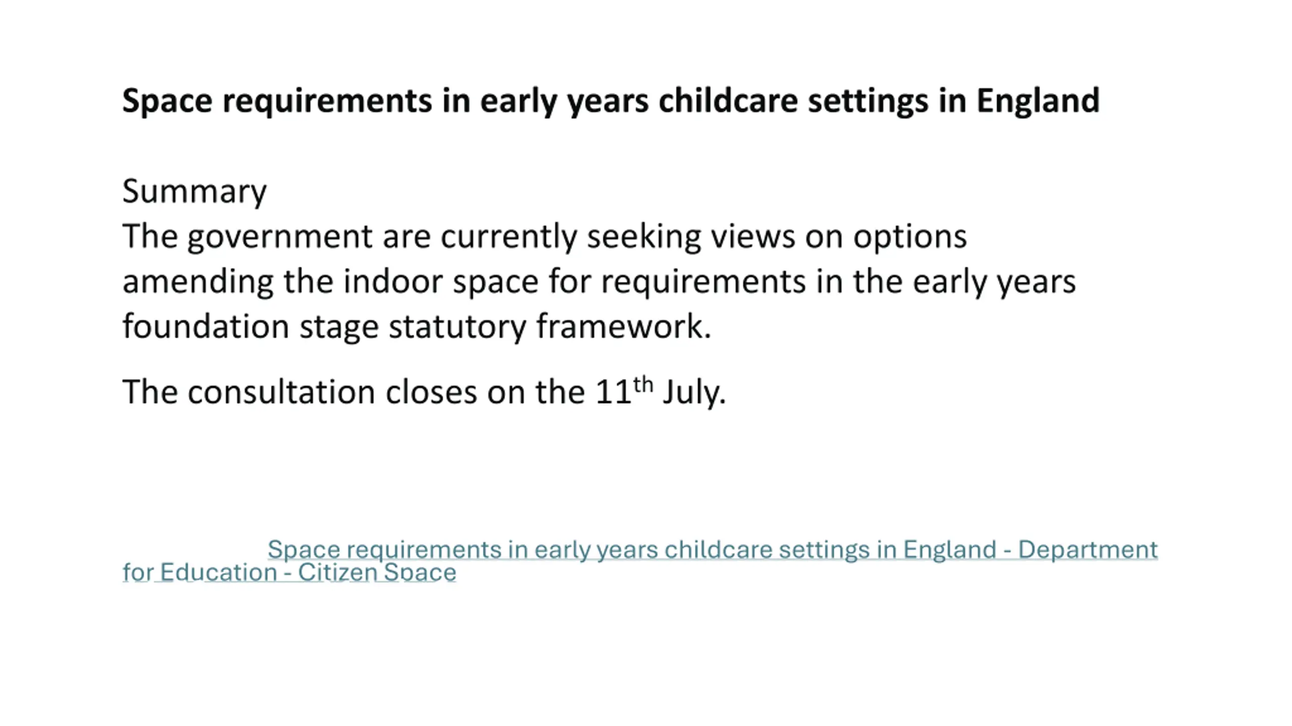 Space requirements in early years childcare settings in England Summary The government are currently seeking views on options amending the indoor space for requirements in the early years foundation stage statutory framework. Summar The consultation closes on the 11th July. We are seeking views on Ofste We are seeking views on options for amending the indoor space requirements in Of options for amending the indoor space requirements in the Early Years Foundation Stage (EYFS) statutory frameworks. We are seeking views on options for amending the indoor space requirements in the Early Years Foundation Stage (EYFS) statutory frameworks. This at This consultation iSpace requirements in early years childcare settings in England - Department for Education - Citizen Spaces being held on another 11:59pm on 11 July 2025 This consultation closes at 11:59pm on 11 July 2025 e Early Years Foundation Stage (EYFS) statutory frameworks. This consultation is being held onThis consultation closes at 11:59pm on 11 July 2025