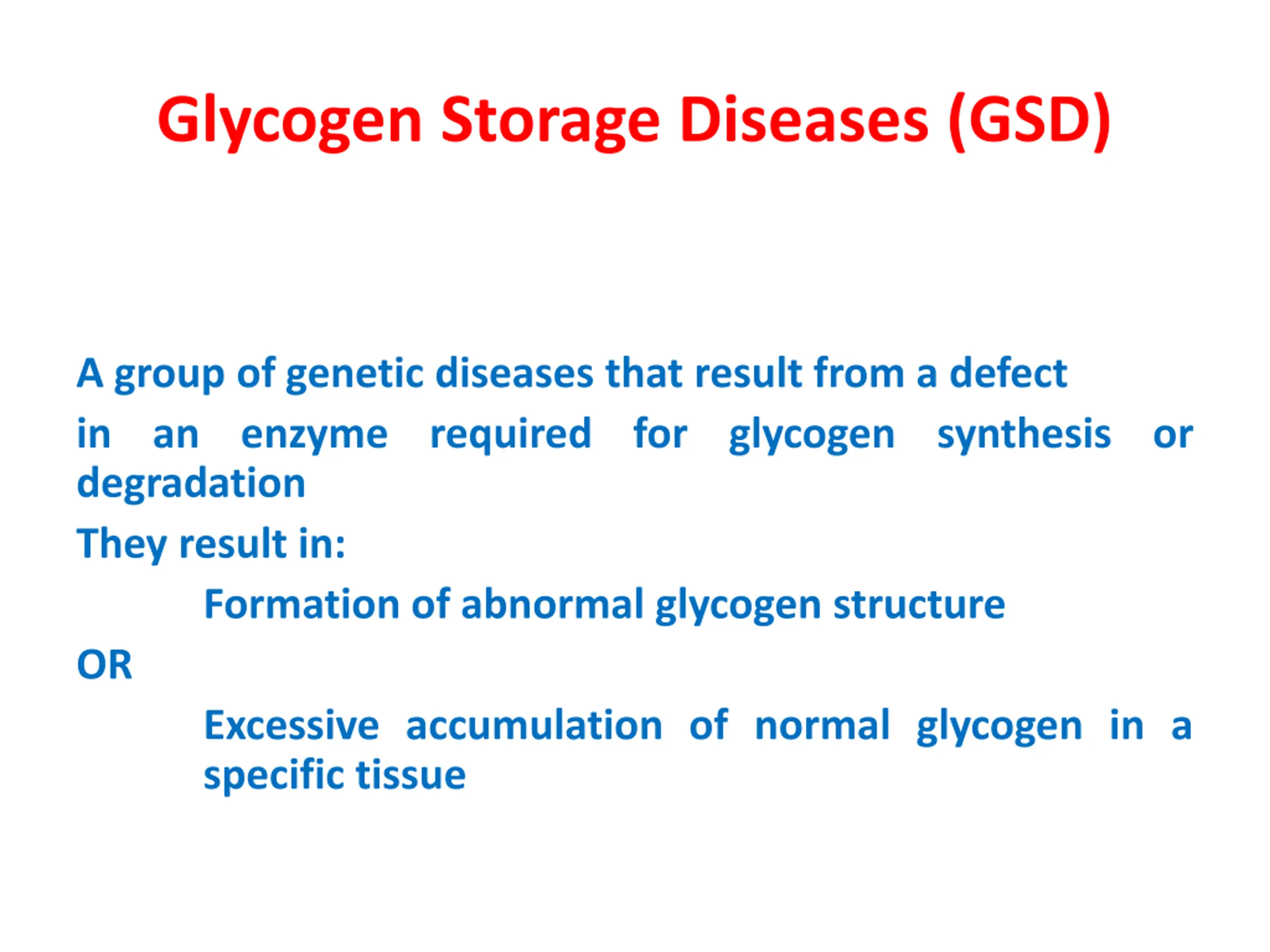Glycogen Storage Diseases (GSD) A group of genetic diseases that result from a defect in an enzyme required for glycogen synthesis or degradation They result in: Formation of abnormal glycogen structure OR Excessive accumulation of normal glycogen in a specific tissue