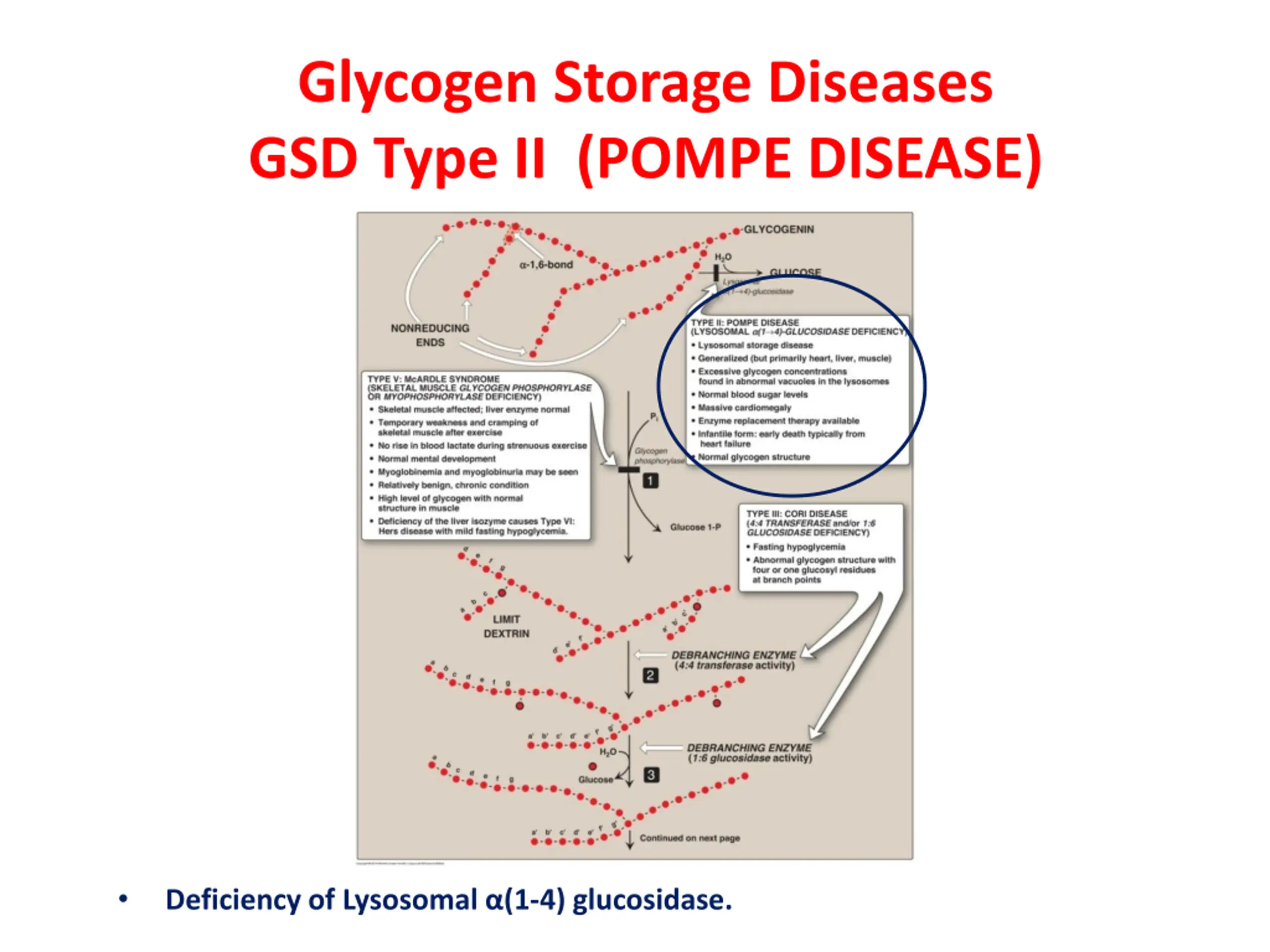 Glycogen Storage Diseases GSD Type II (POMPE DISEASE) Deficiency of Lysosomal (1-4) glucosidase.