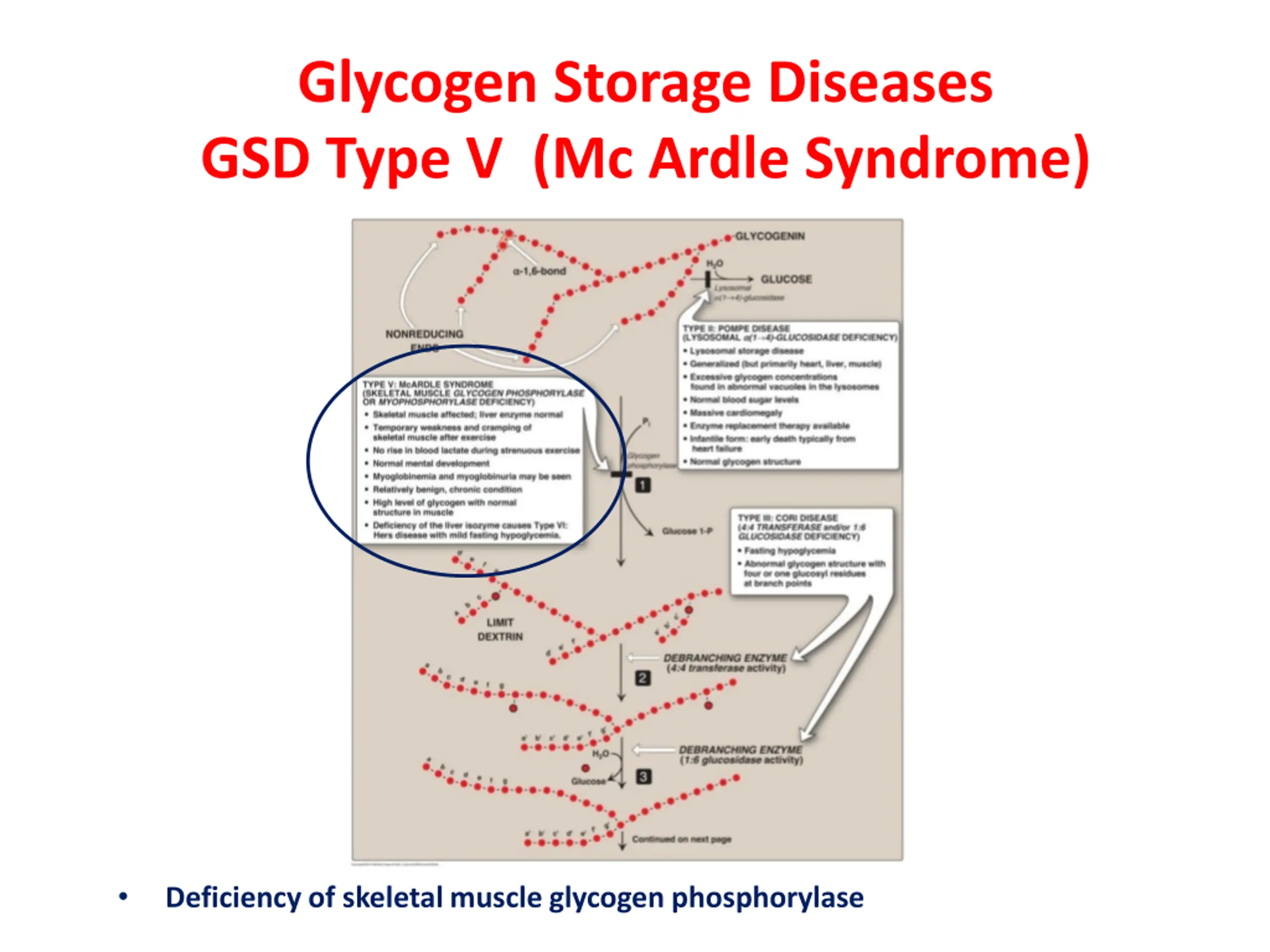 Glycogen Storage Diseases GSD Type V (Mc Ardle Syndrome) Deficiency of skeletal muscle glycogen phosphorylase