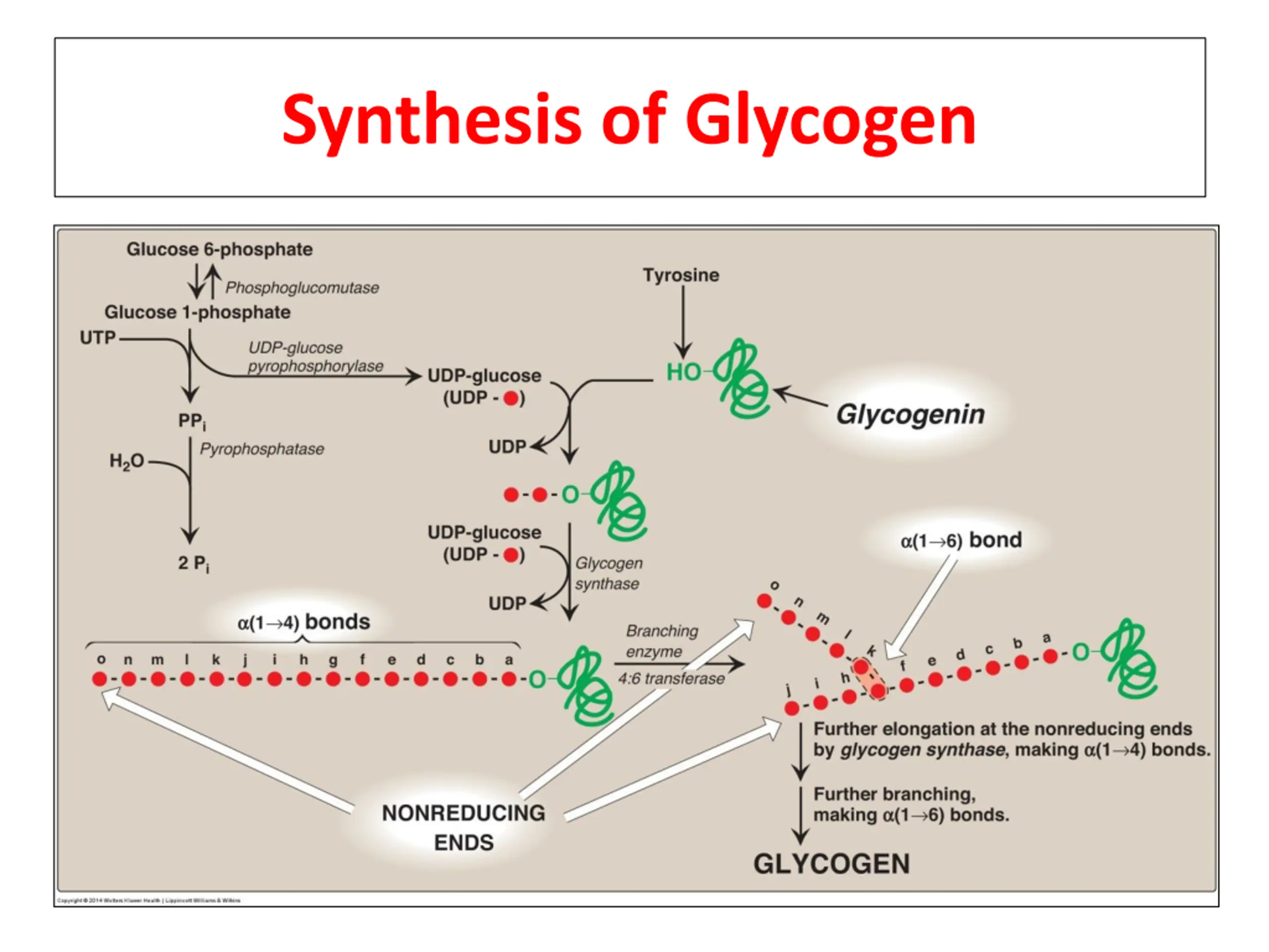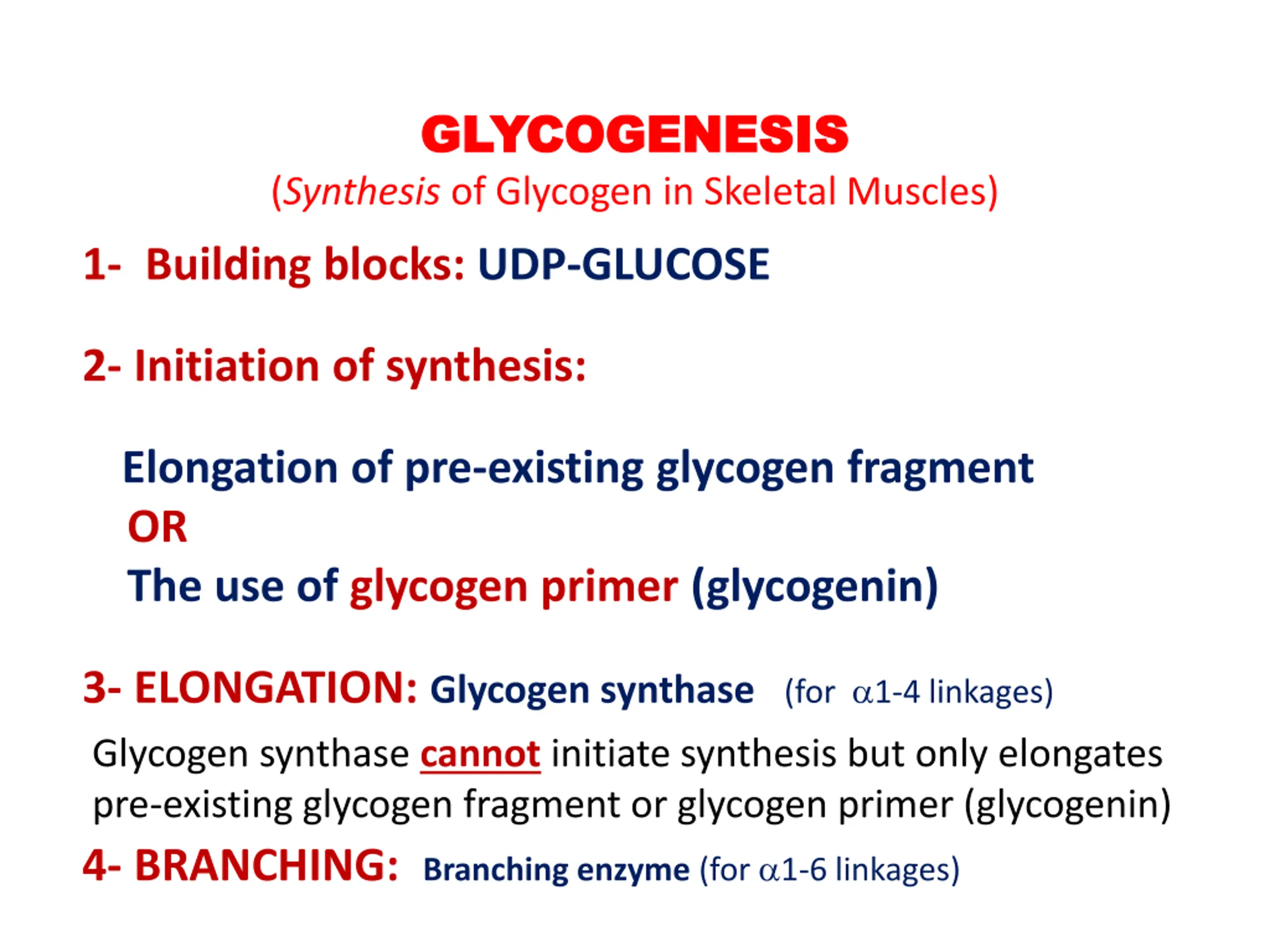 GLYCOGENESIS GLYCOGENESIS (Synthesis of Glycogen in Skeletal Muscles) 1- Building blocks: UDP-GLUCOSE 2- Initiation of synthesis: Elongation of pre-existing glycogen fragment OR The use of glycogen primer (glycogenin) 3- ELONGATION: Glycogen synthase (for 1-4 linkages) Glycogen synthase cannot initiate synthesis but only elongates pre-existing glycogen fragment or glycogen primer (glycogenin) 4- BRANCHING: Branching enzyme (for 1-6 linkages)