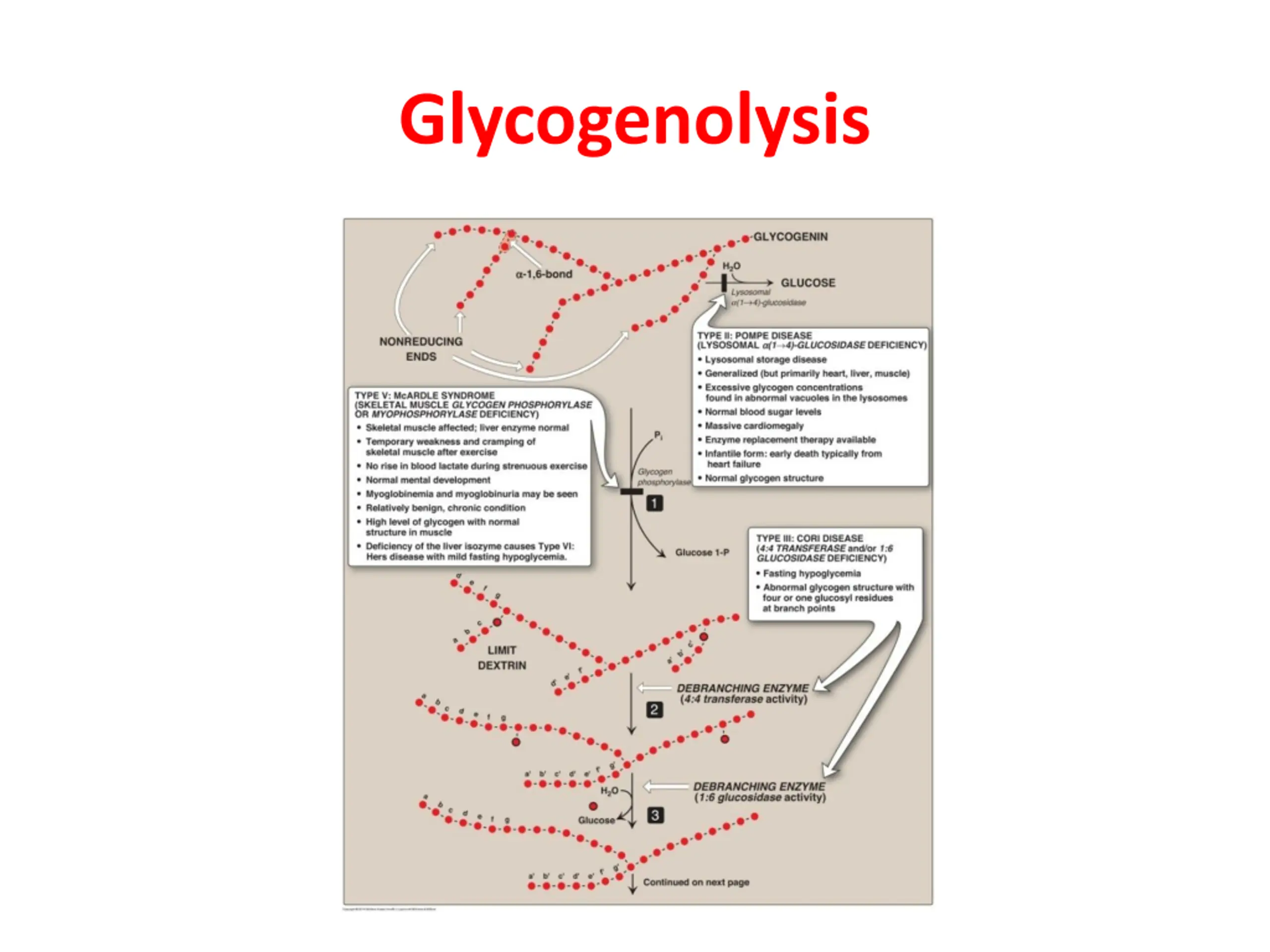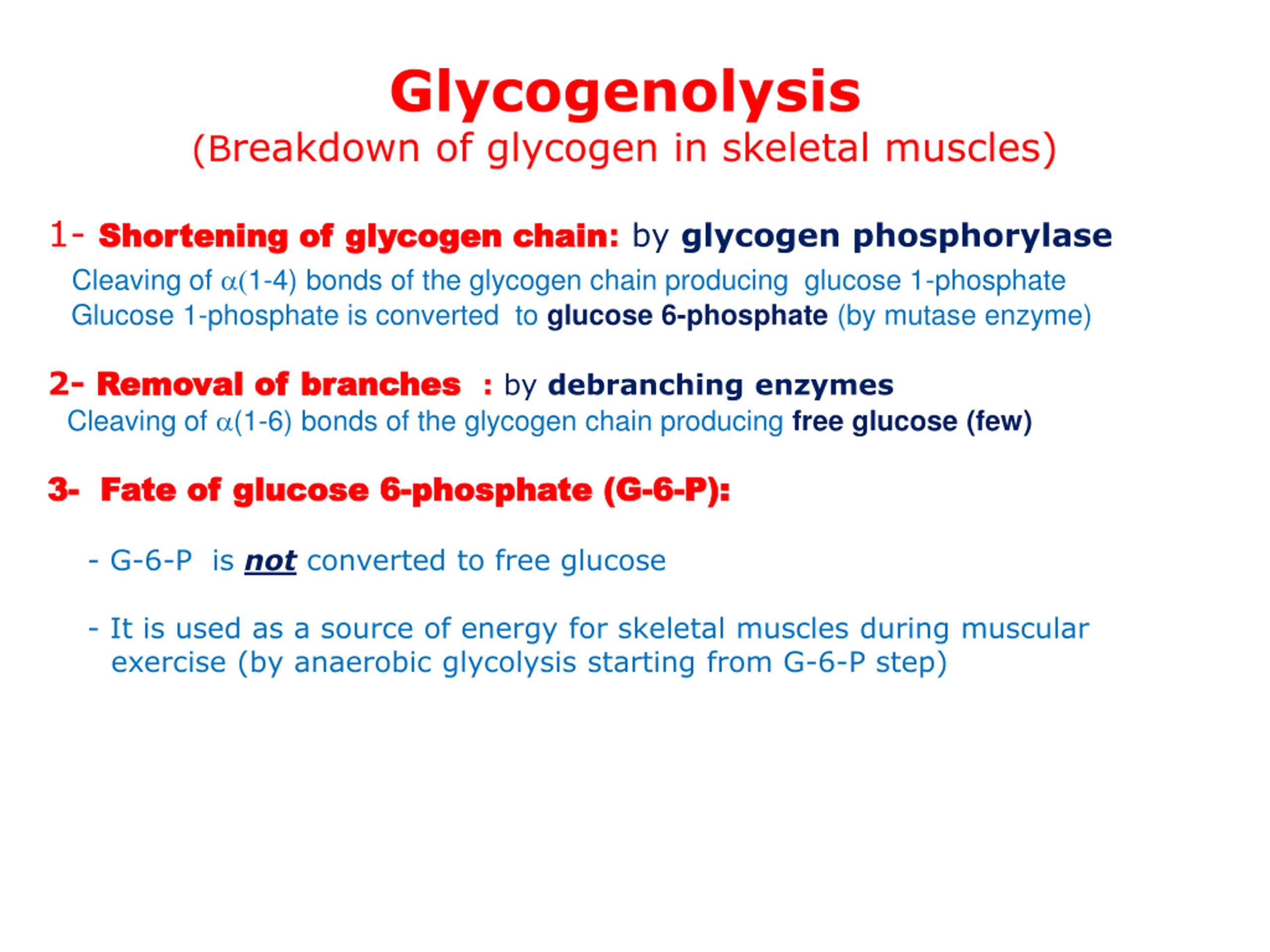 Glycogenolysis (Breakdown of glycogen in skeletal muscles) 1- Shortening of glycogen chain Shortening of glycogen chain: by glycogen phosphorylase Cleaving of (1-4) bonds of the glycogen chain producing glucose 1-phosphate Glucose 1-phosphate is converted to glucose 6-phosphate (by mutase enzyme) 2- Removal of branches Removal of branches : by debranching enzymes Cleaving of (1-6) bonds of the glycogen chain producing free glucose (few) 3 3- - Fate of glucose 6 Fate of glucose 6- -phosphate (G phosphate (G- -6 6- -P): P): - G-6-P is not converted to free glucose - It is used as a source of energy for skeletal muscles during muscular exercise (by anaerobic glycolysis starting from G-6-P step)