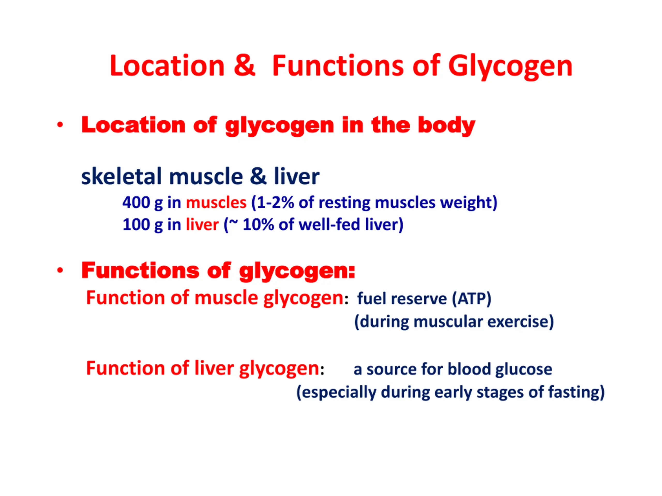 Location & Functions of Glycogen Location of glycogen in the body Location of glycogen in the body skeletal muscle & liver 400 g in muscles (1-2% of resting muscles weight) 100 g in liver (~ 10% of well-fed liver) Functions of glycogen: Functions of glycogen: Function of muscle glycogen: fuel reserve (ATP) (during muscular exercise) Function of liver glycogen: a source for blood glucose (especially during early stages of fasting)