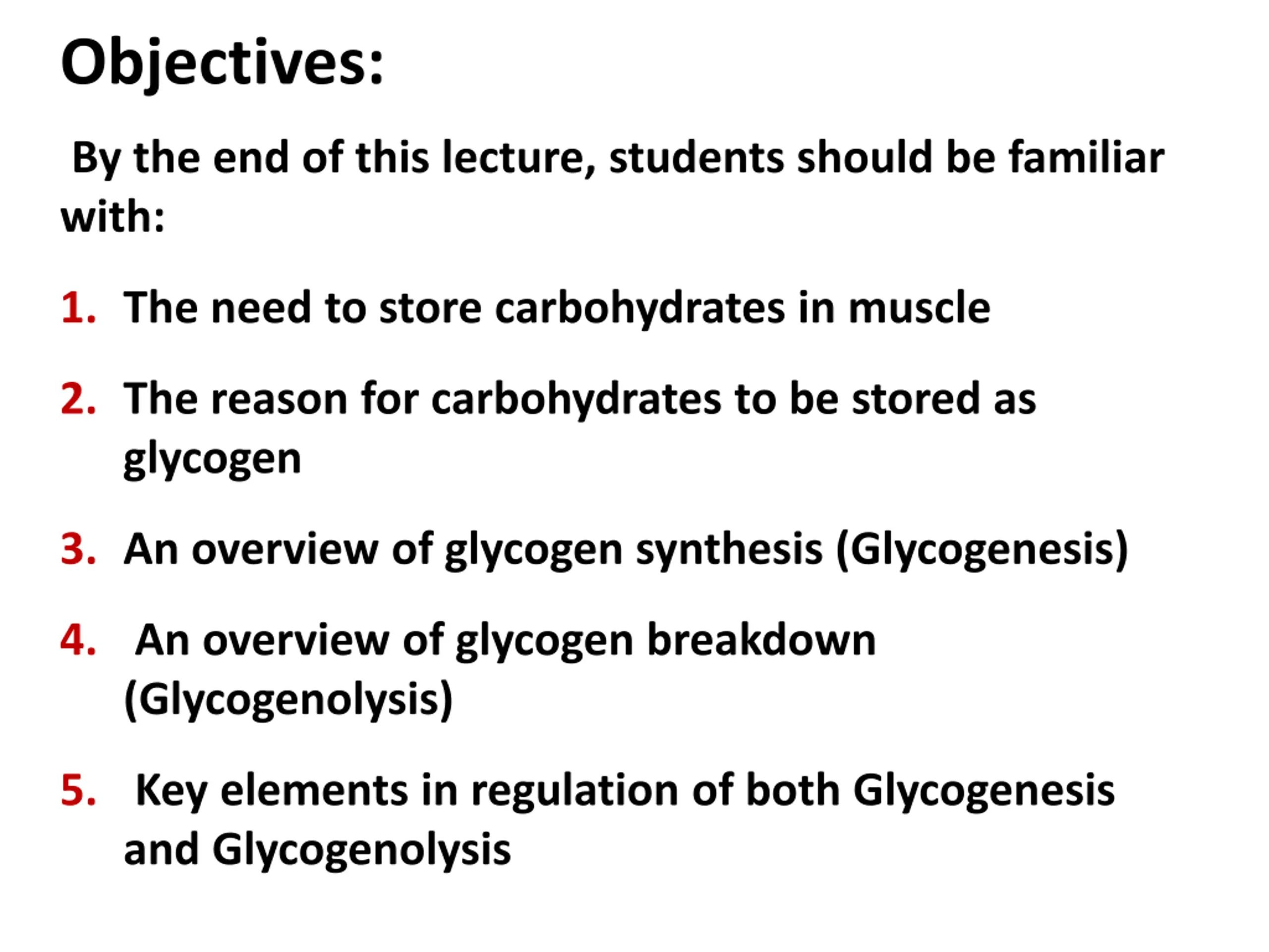 Objectives: By the end of this lecture, students should be familiar with: 1. The need to store carbohydrates in muscle 2. The reason for carbohydrates to be stored as glycogen 3. An overview of glycogen synthesis (Glycogenesis) 4. An overview of glycogen breakdown (Glycogenolysis) 5. Key elements in regulation of both Glycogenesis and Glycogenolysis