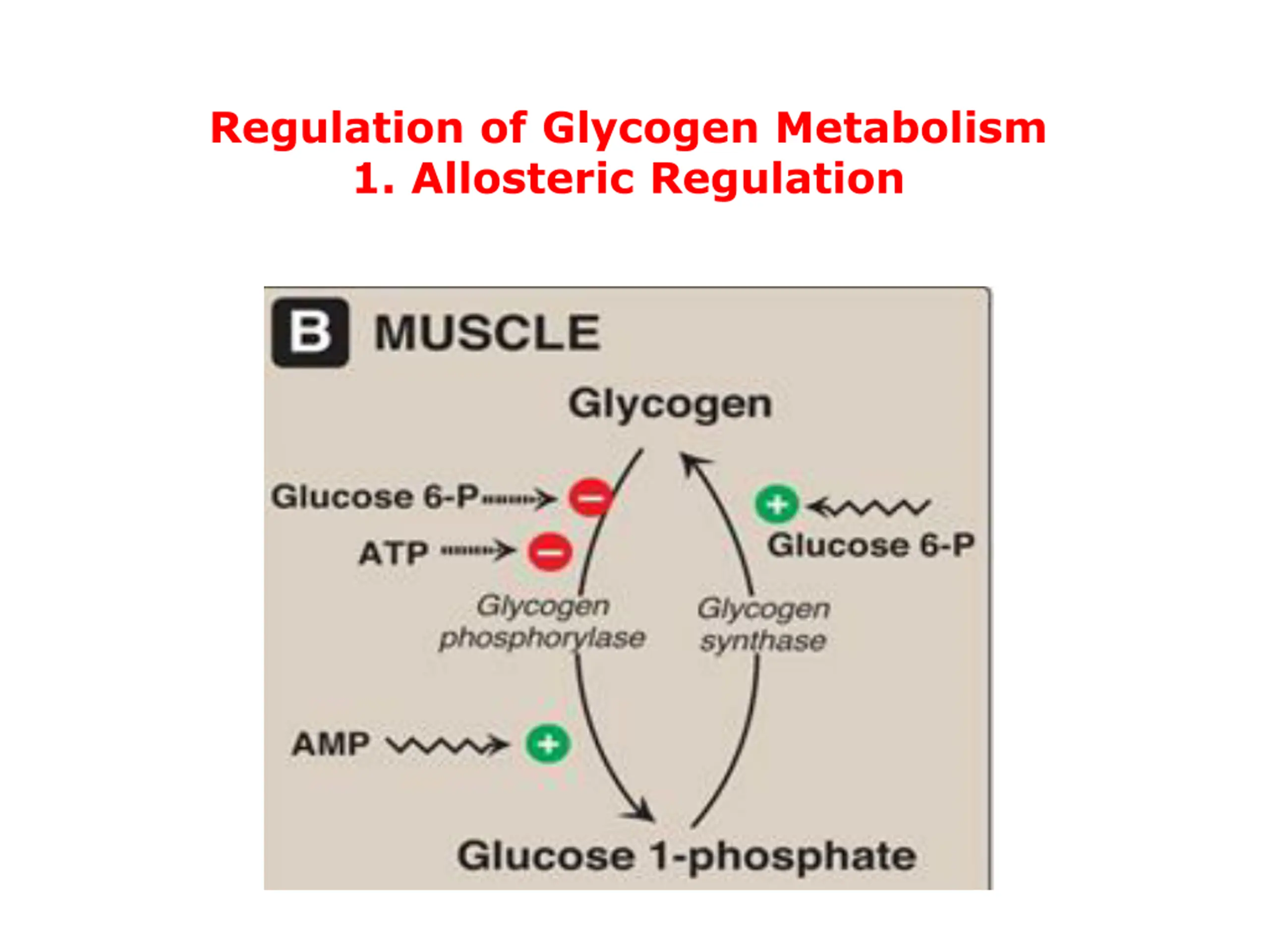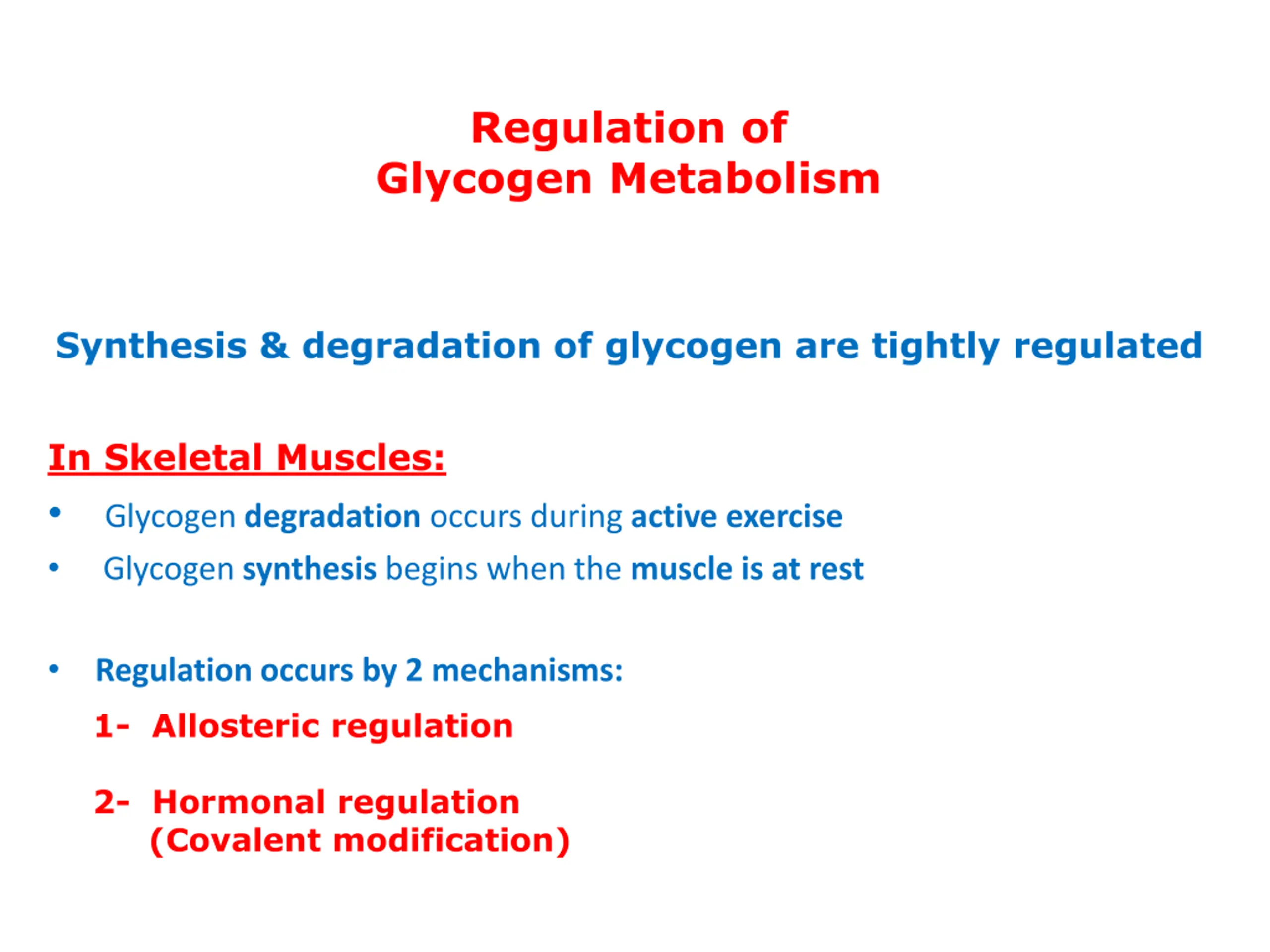 Regulation of Glycogen Metabolism Synthesis & degradation of glycogen are tightly regulated In Skeletal Muscles: Glycogen degradation occurs during active exercise Glycogen synthesis begins when the muscle is at rest Regulation occurs by 2 mechanisms: 1- Allosteric regulation 2- Hormonal regulation (Covalent modification)